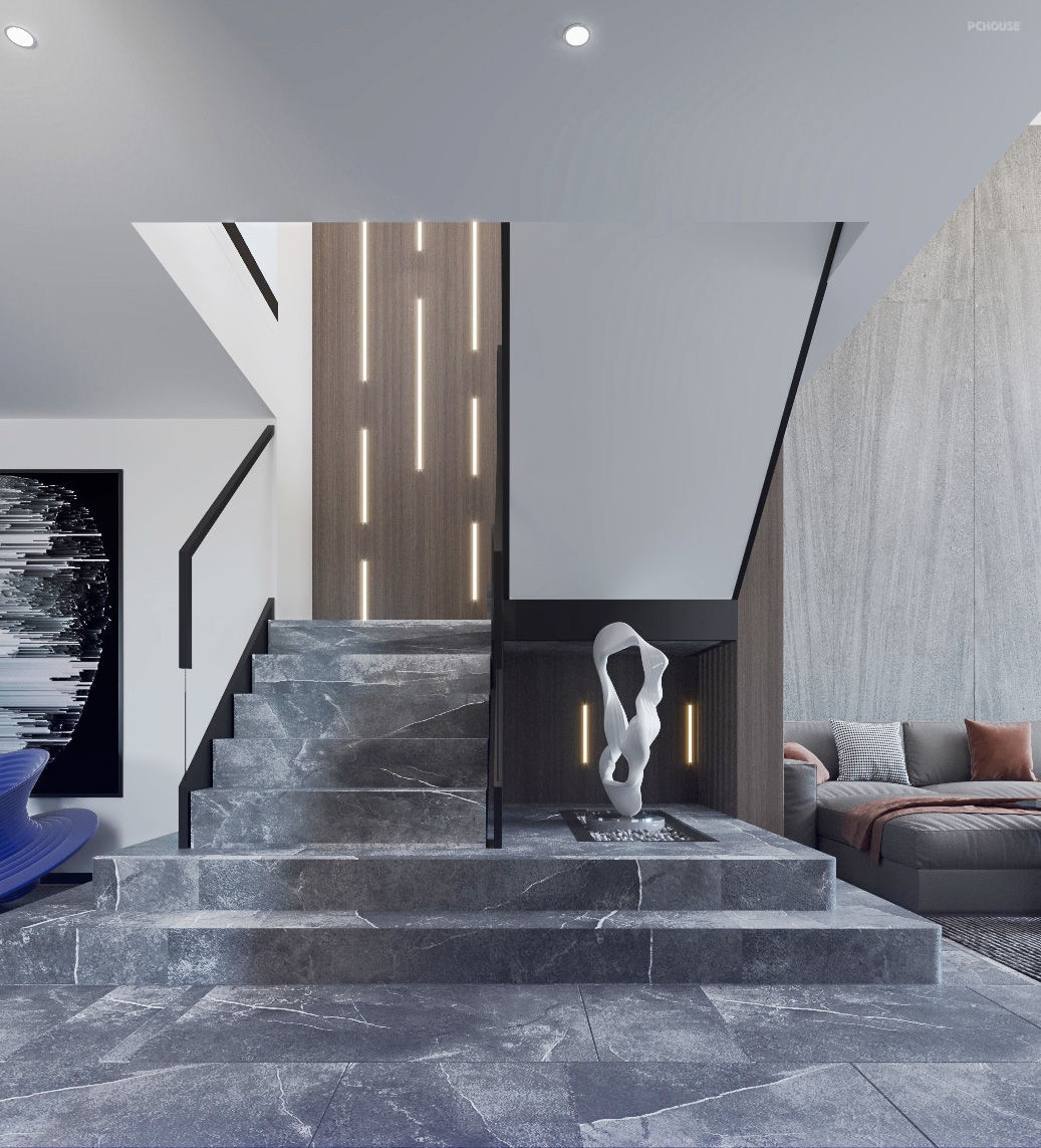 本案为复式大宅,一层具备前后花园,宽广的视野和采光;周围绿植覆盖率很高,清晨室外的阳光空气,可直接与室内互动交流,让心灵与大自然来一次亲密无间的接触,享受此刻平静,回归无我。二层主要为主卧及小孩房,另外还设置亲子互动空间与书房,更关注孩子的喜好,与孩子的身心紧密关联,增加家庭藏书,培养家庭成员的学习习惯把自己的家庭建设成知书达礼的书香门第。因户型较大,我们在二层增加了一个人性化的水吧设计,使生活更便捷。