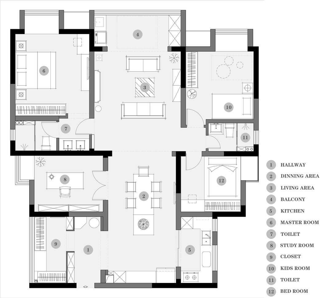 屋主需求: 1.现代法式风,除地暖后2.7米的层高,有中央空调的需求,不喜欢挂机柜机 2.满足三个卧室外需要有独立的书房及衣帽间 3.喜欢开放式厨房,但又对油烟有顾虑 4.喜欢法式双开门的大气感 5.卫生间过小,希望能改善 6.喜欢看电视,但不想要传统意义的电视墙