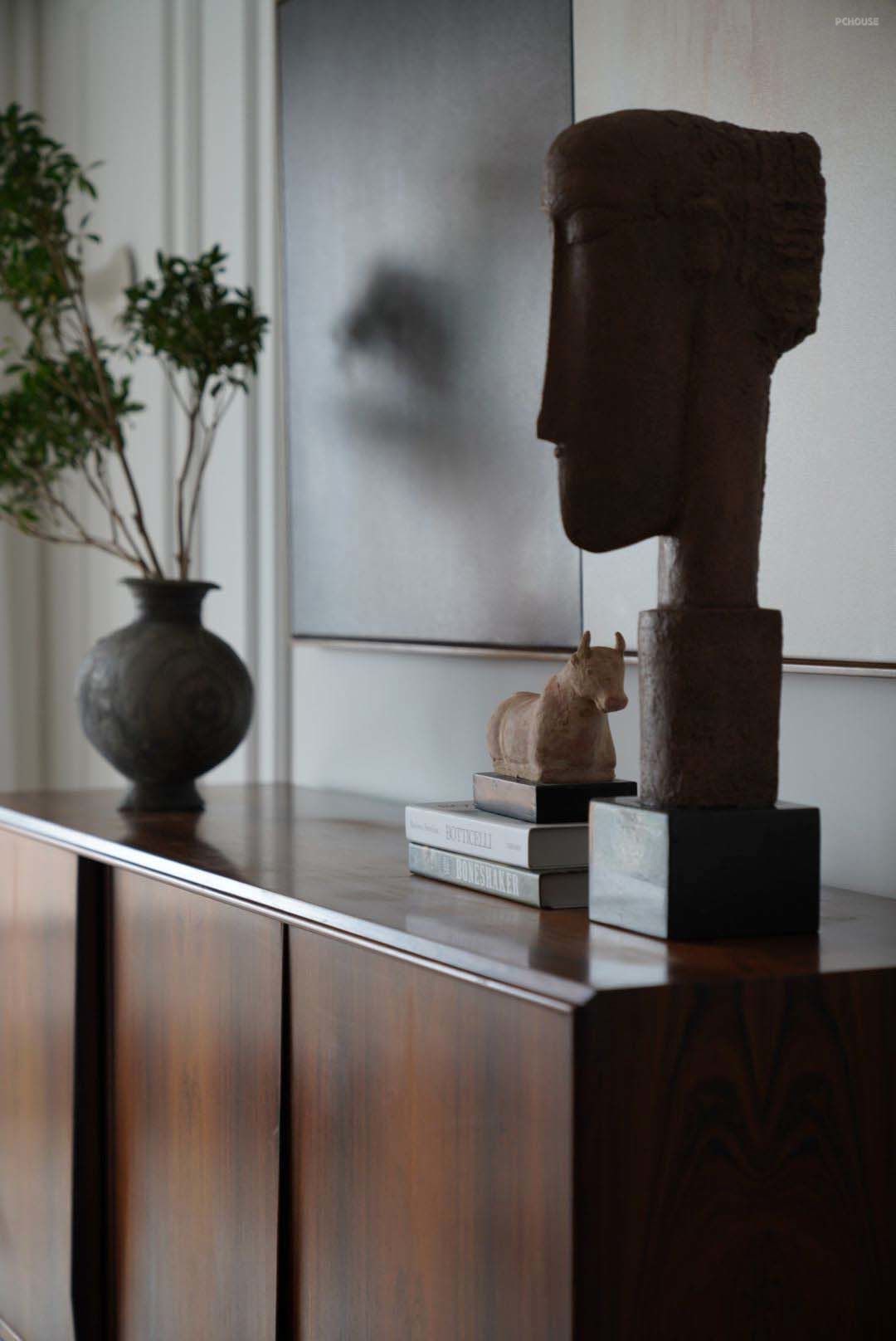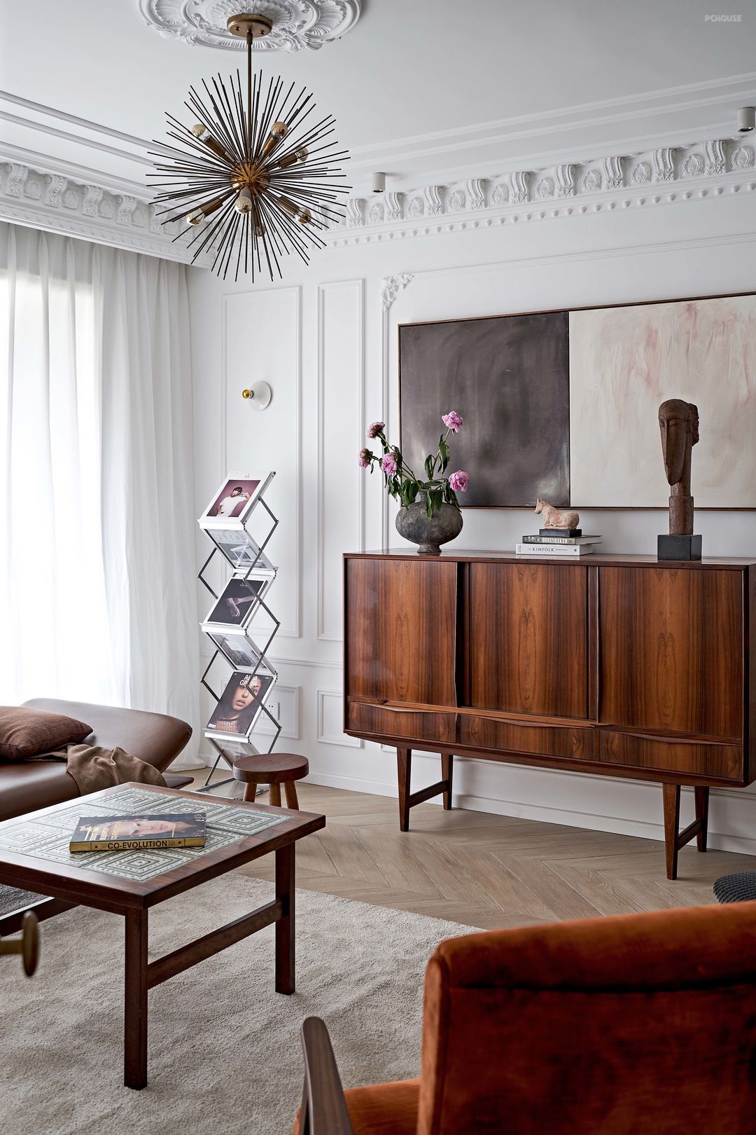 摒弃掉传统客厅的布局,以围合对坐的方式,增进了家人间交流的距离感,提升空间的氛围 中古装饰柜:丹瑞万象 茶几:丹瑞万象 三人沙发:博领 单人沙发:Hodays 小边凳:MDL 中古吊灯:回到二十世纪 壁灯: artemide 挂画:crisis art 雕塑摆件:Chairish 土陶罐:物集