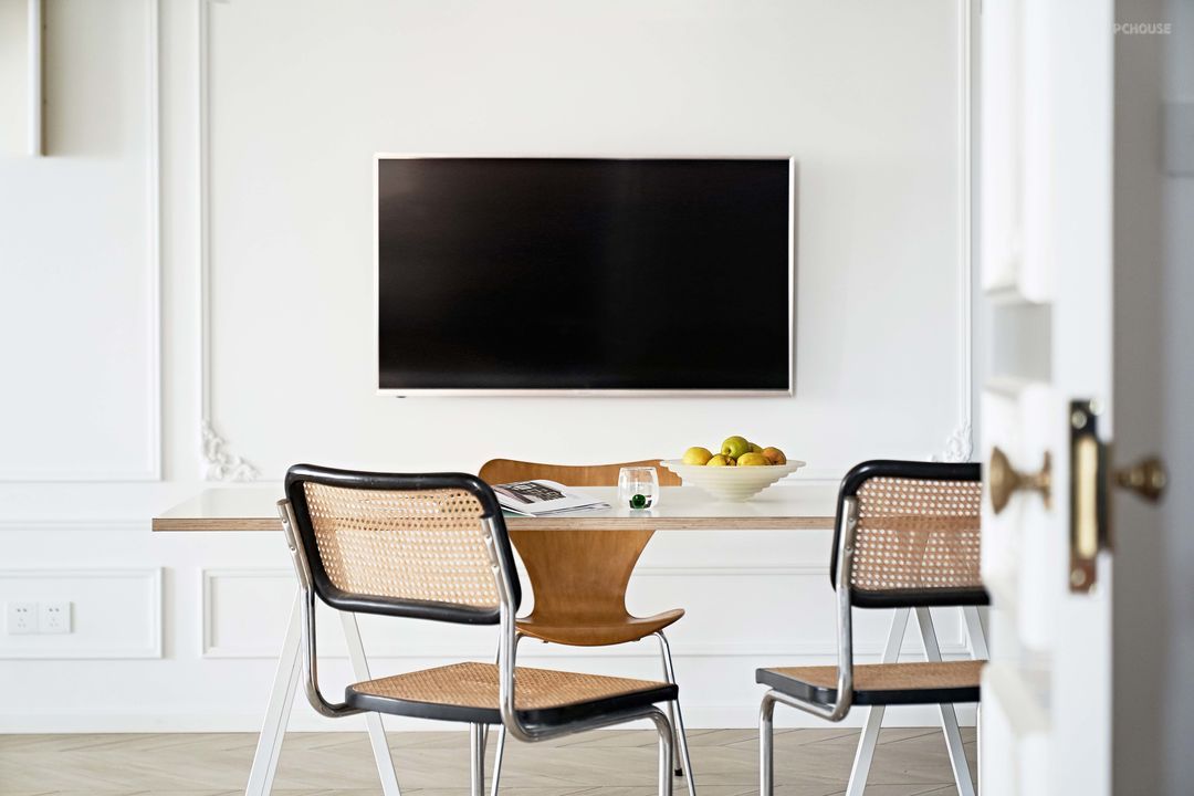 屋主就餐时有追剧的习惯,将电视放置在餐厅区域,水电改造时电视机背后内凹小壁龛预留插座与机顶盒位,避免线路的凌乱影响餐厅美观