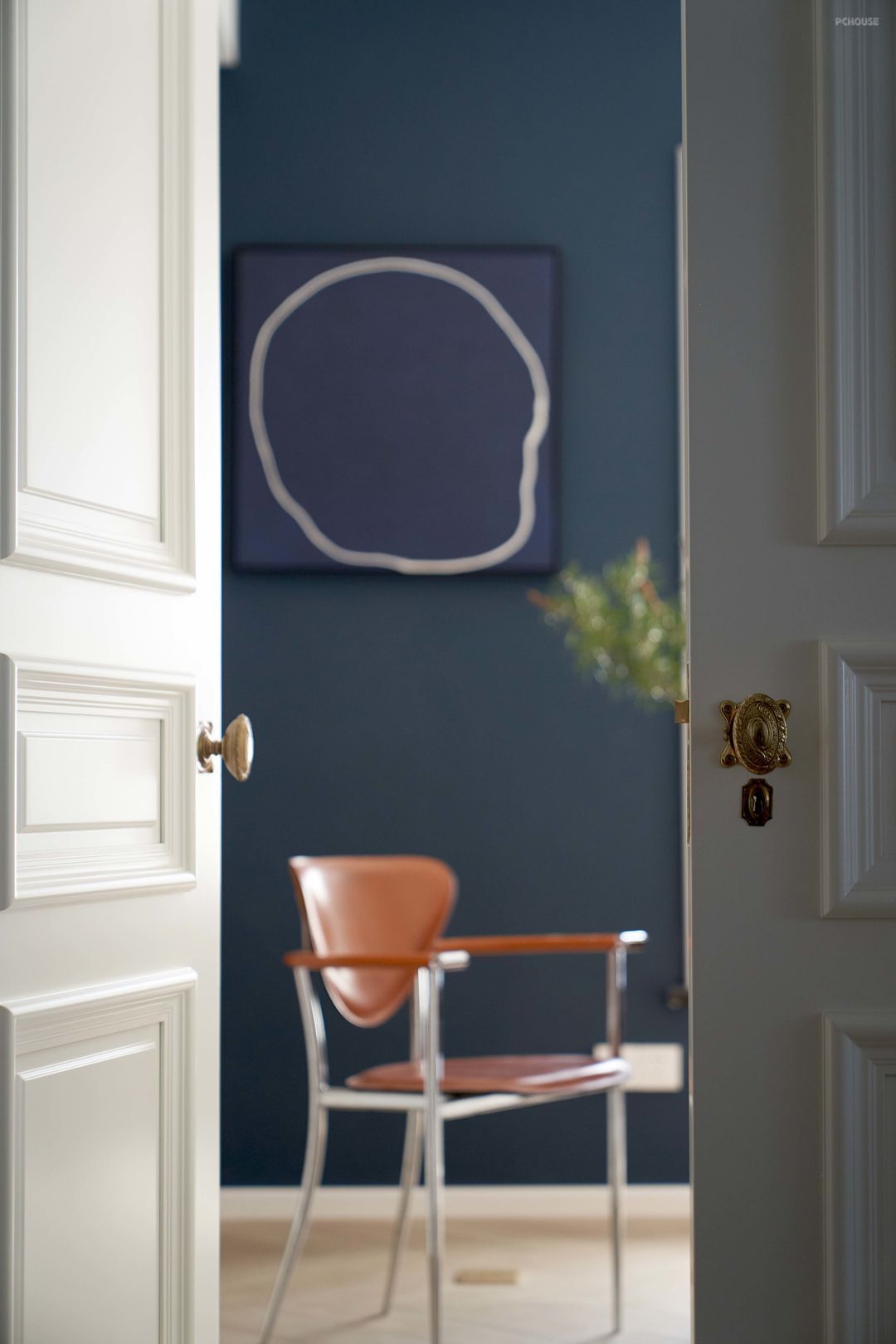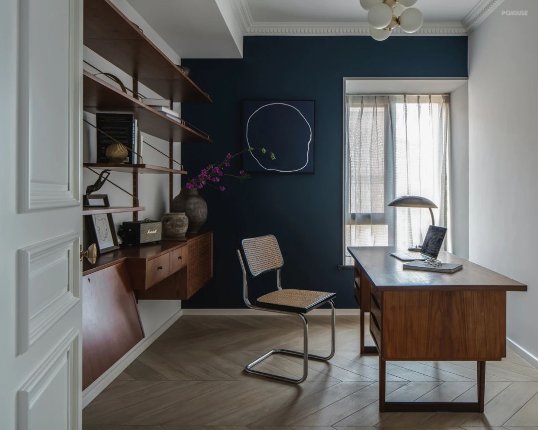 书房算是屋主比较密集的中古收藏空间了。摒弃满满的定制书柜的方式,选择开放式书架,增强空间的开阔感。深蓝的墙面与中古的木作搭配,提升空间的复古感。 开放式书架:伽罗生活 中古书桌:Hodays 中古台灯:Hodays 吊灯:Hodays 土陶罐:物集 油画:定制