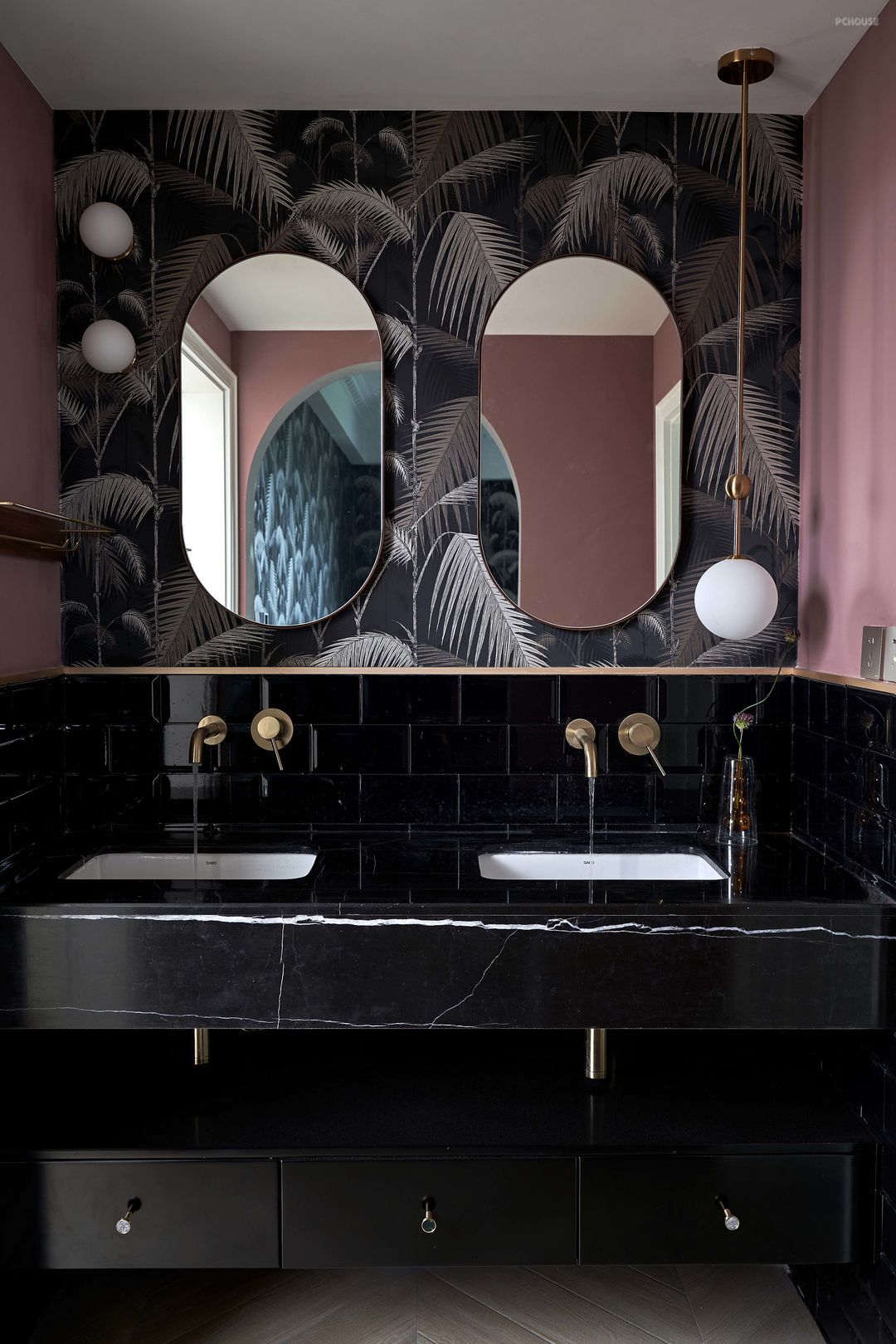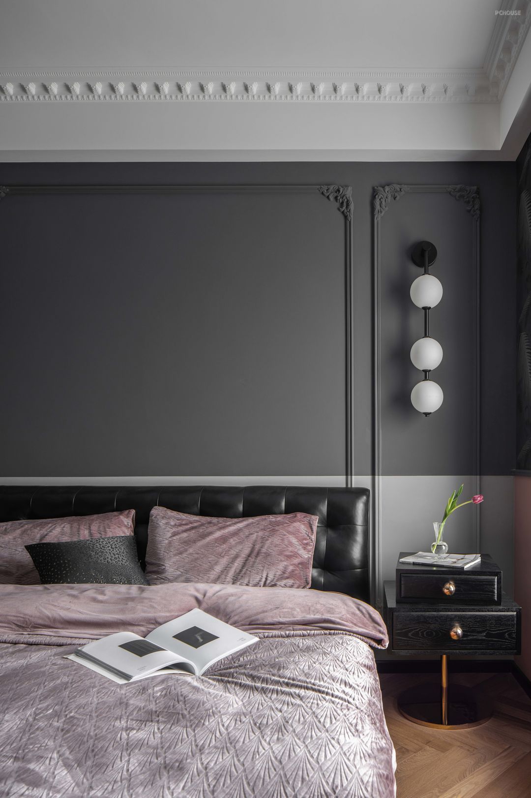 卧室作为私密区域,想要呈现与公共空间不同的调性。配合恋旧的屋主使用多年的床,主卧上墙深灰主调与深色棕榈款壁纸,搭配下墙浅灰与脏粉拼色,空间充满戏剧性、复古感。呈现精致、优雅、静谧的氛围。