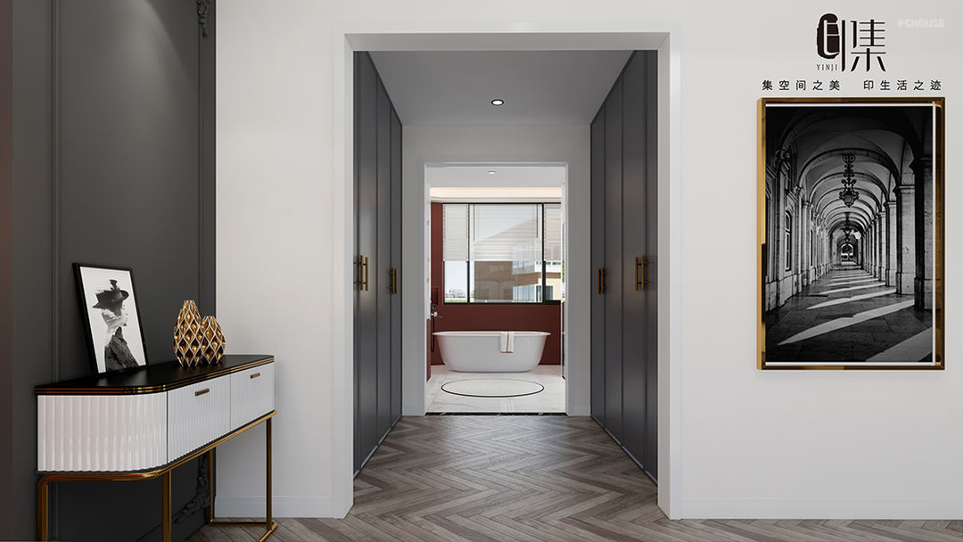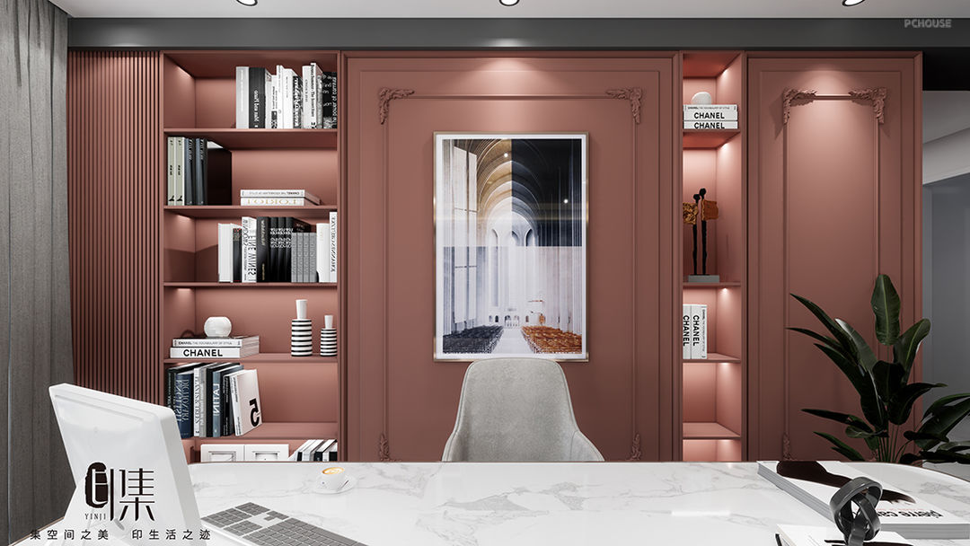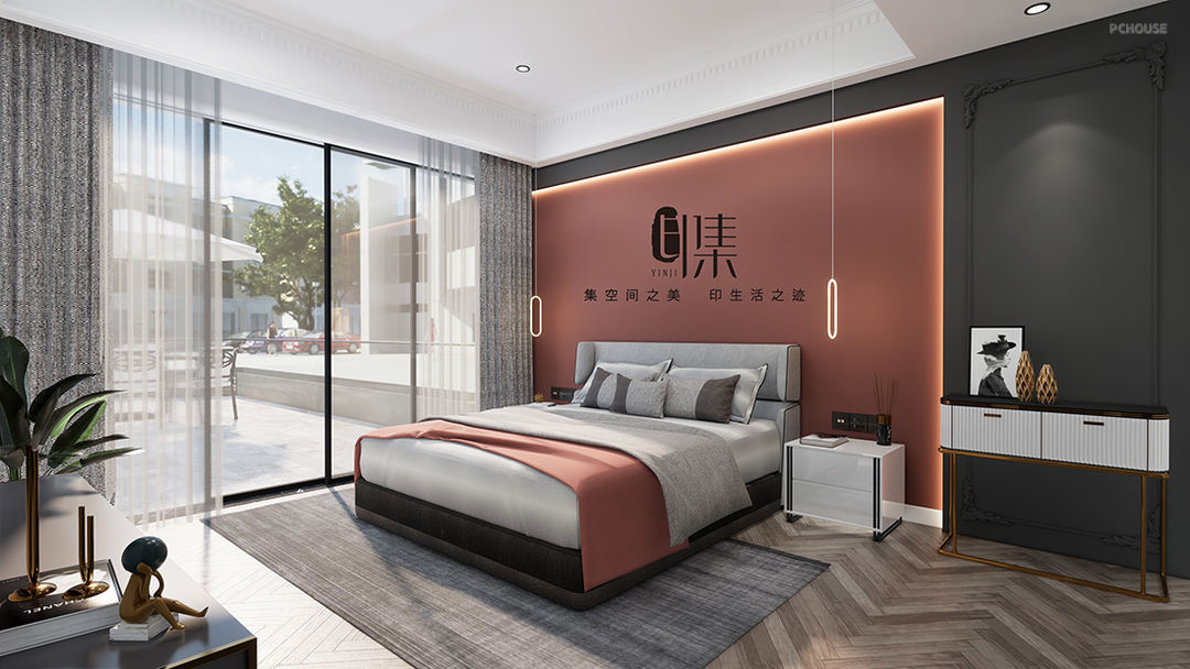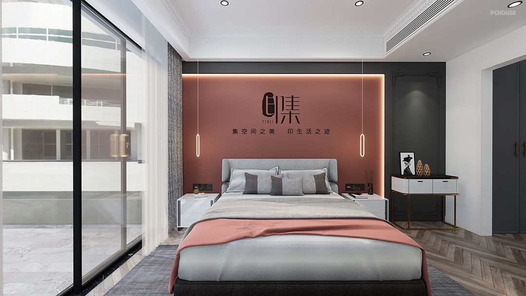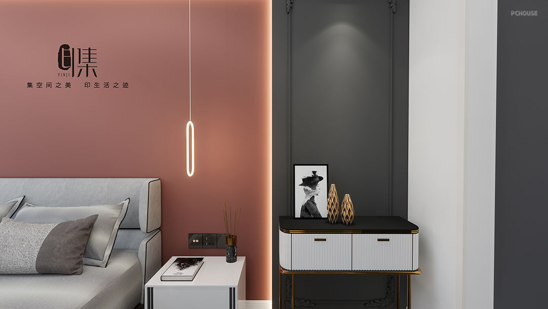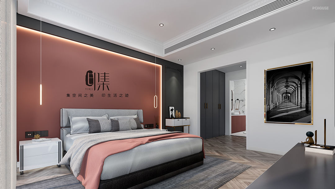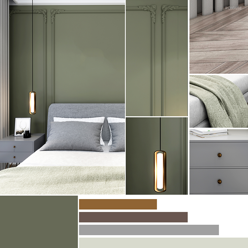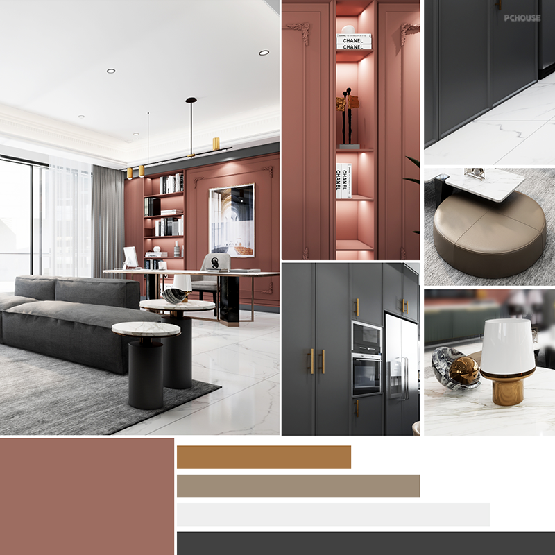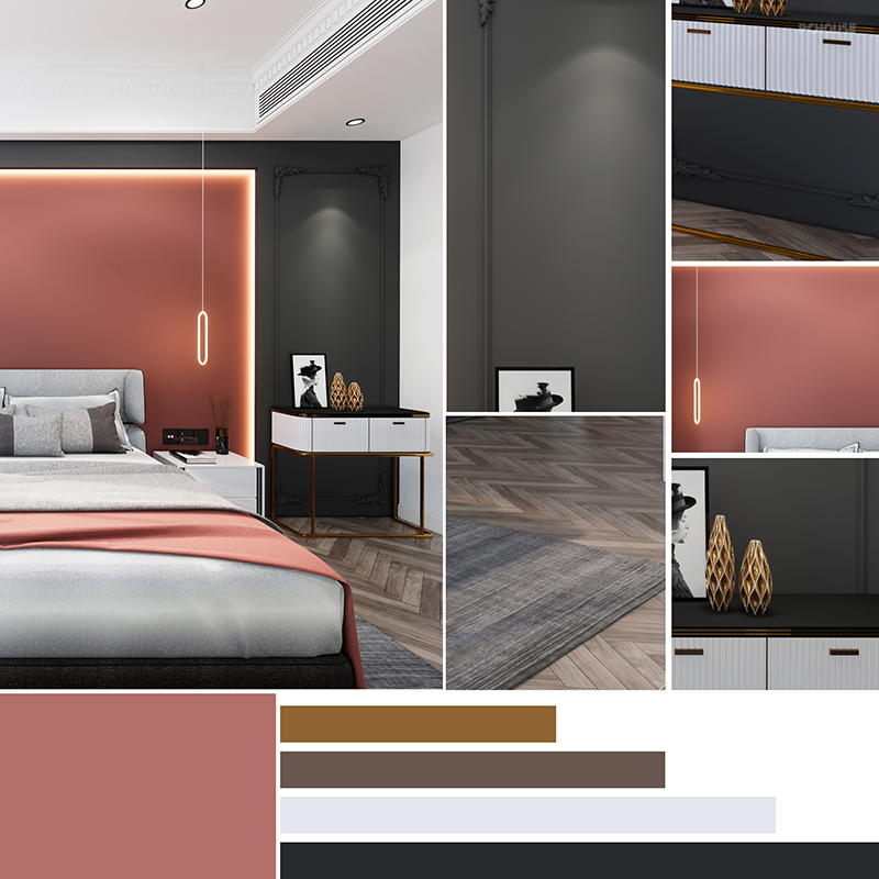主卧色彩:脏粉色+黄铜金+原木棕+爵士白+暗灰色