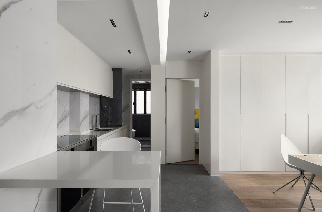 封闭的小厨房拆掉,做成开放式厨房,和餐区的吧台参照呼应,形成互借空间的形式,让空间得到提升。门是隐形门,运用与墙板一致的白色 完全隐藏其中,一切都那么自然而然