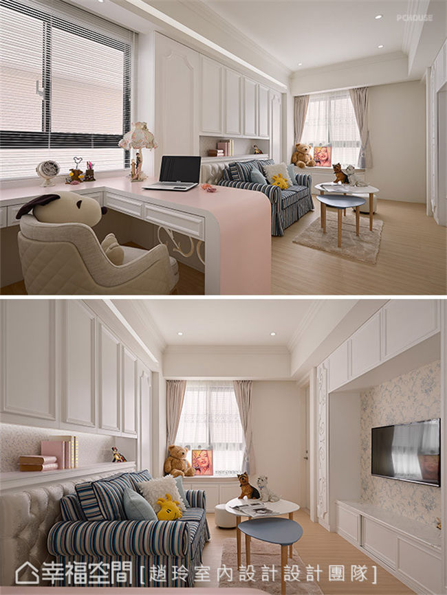 以新古典为设计主轴,白色基底搭配粉色、碎花元素,营造甜美可爱的空间氛围。