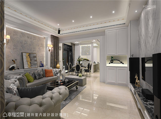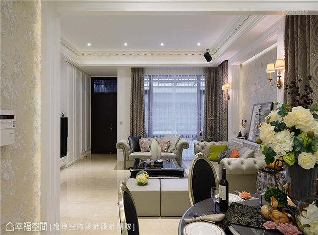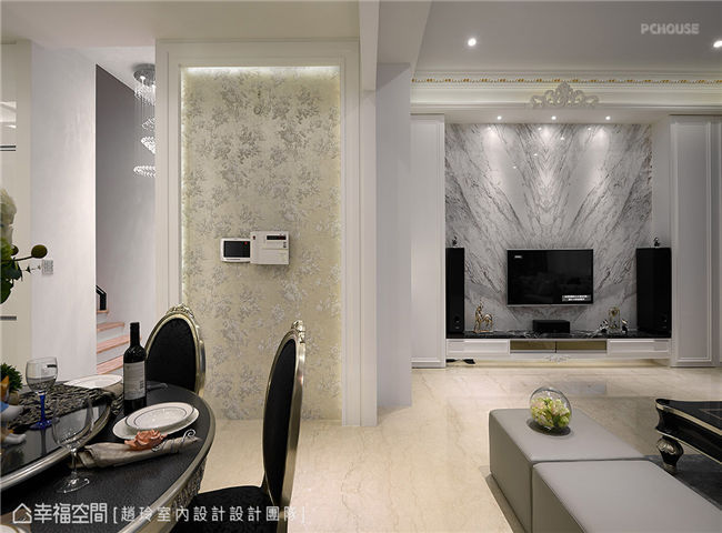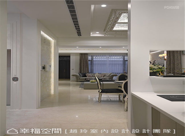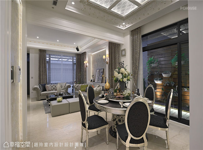 喜爱新古典风格的屋主,希望家中能呈现华丽质感,赵玲与吕学宇设计师采用重点装饰手法,力求跳脱以往对于新古典风格的制式印象,例如餐厅的天花板,采用玻璃结合格栅造型设计,呈现新古典的精致质感,并于四周挂满水晶珠,在光源投射下展现剔透的光影变化,反转餐厅一定要以水晶灯作为主灯的思维。