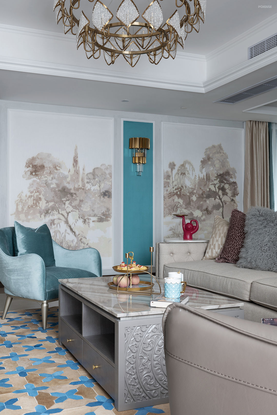 前言: 一个家,什么样的风格,什么样的色彩并不是最重要的,最重要的是最终成就的空间气质,这个气质和居住者的愿景吻合,并在其中得到舒适与放松。这套案例并不是纯粹的某一种风格的呈现,在风格元素上,法式、美式、现代,每一种元素都在空间里有体现,颜色上,紫色、蓝色、棕色、粉色,再加上贯穿始终的蒂芙尼蓝,造就了最终慵懒、舒适、既时髦又复古的混搭空间,温柔的安抚了居住者所有外出归家的疲惫。