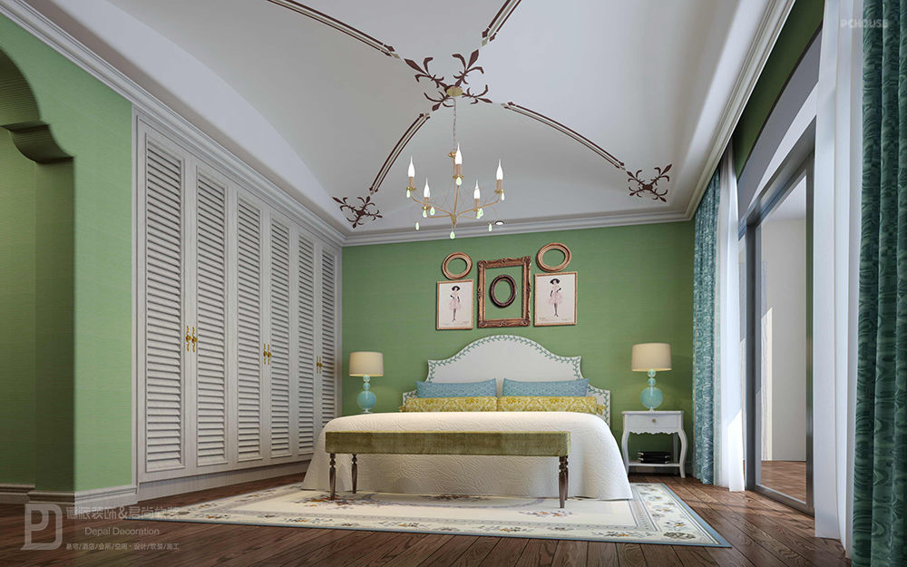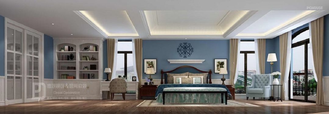 美式风格的主卧设计,凹凸式吊顶搭配着精致的吊灯,纯白色的定制柜,白色与浅蓝色的石膏板搭配着精致的相框画,舒适的大床温馨又大气