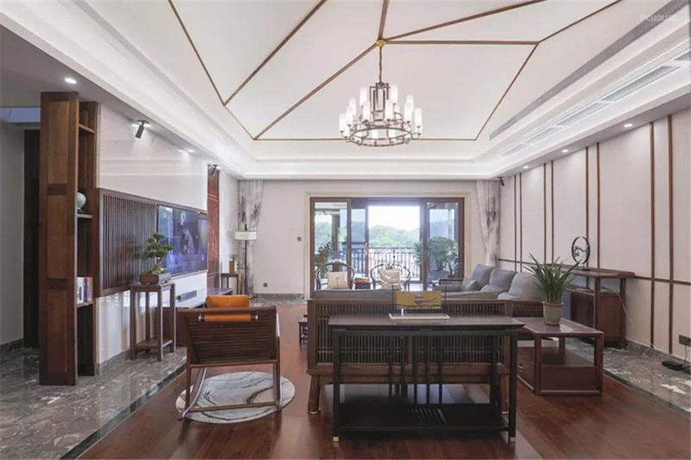 室内陈设家具选择了简洁利落的新中式家具,沙发背景墙与吊顶的线条装饰,动静呼应。配饰上则重点突出中式元素,如中式风格的金属吊灯、沙发后的摆件等,古典配色,清淡素雅,给空间带去了浓浓的生活情趣。