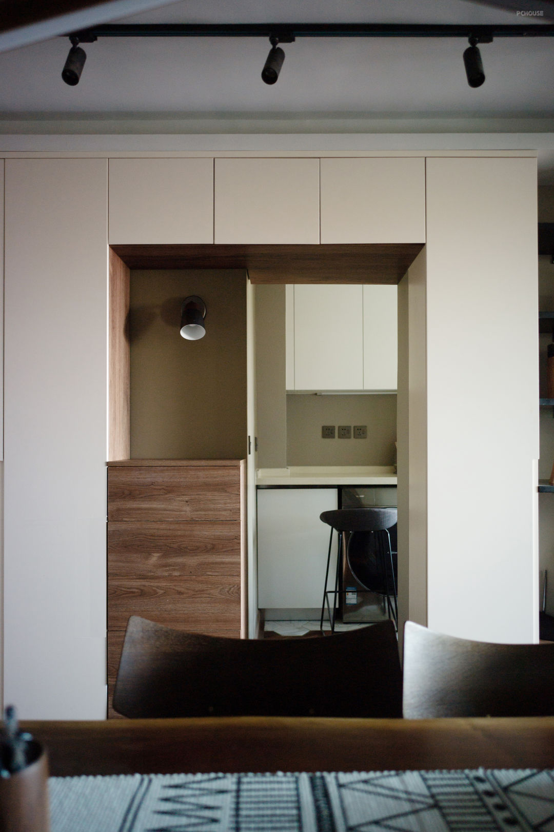 客厅没有按常规方式布置,而是让餐厅成为客厅的中心。客厅增加了一排到顶的储物柜,储物柜是结合厨房门洞来做的,坐在卡座上看向厨房的视线正好穿过储物柜的中心。