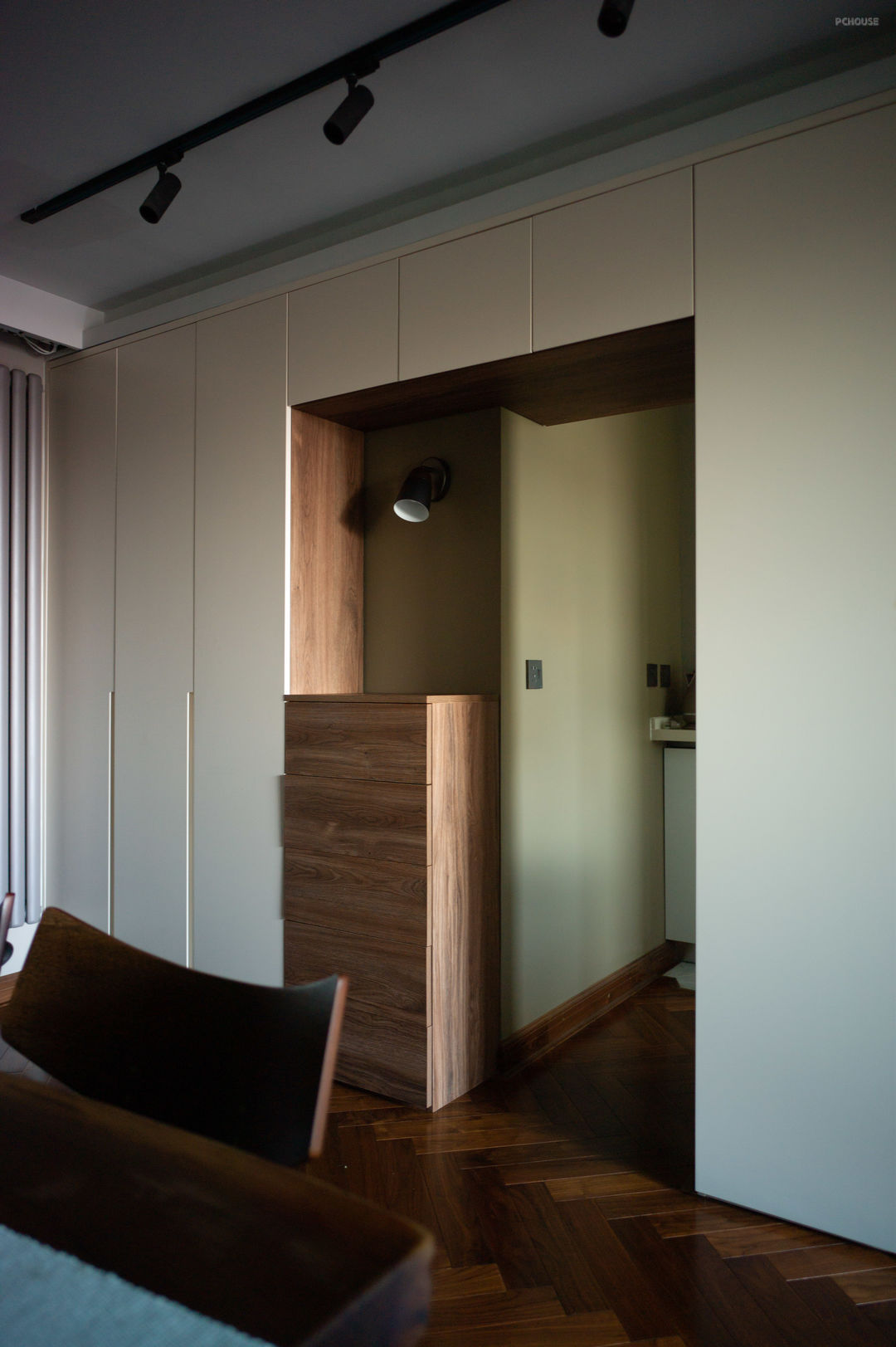一般老房的门洞比较矮,通过柜子和洞口结合的方式,从视觉上扩大洞口的视线。抽屉矮柜是女主人梳妆的区域。