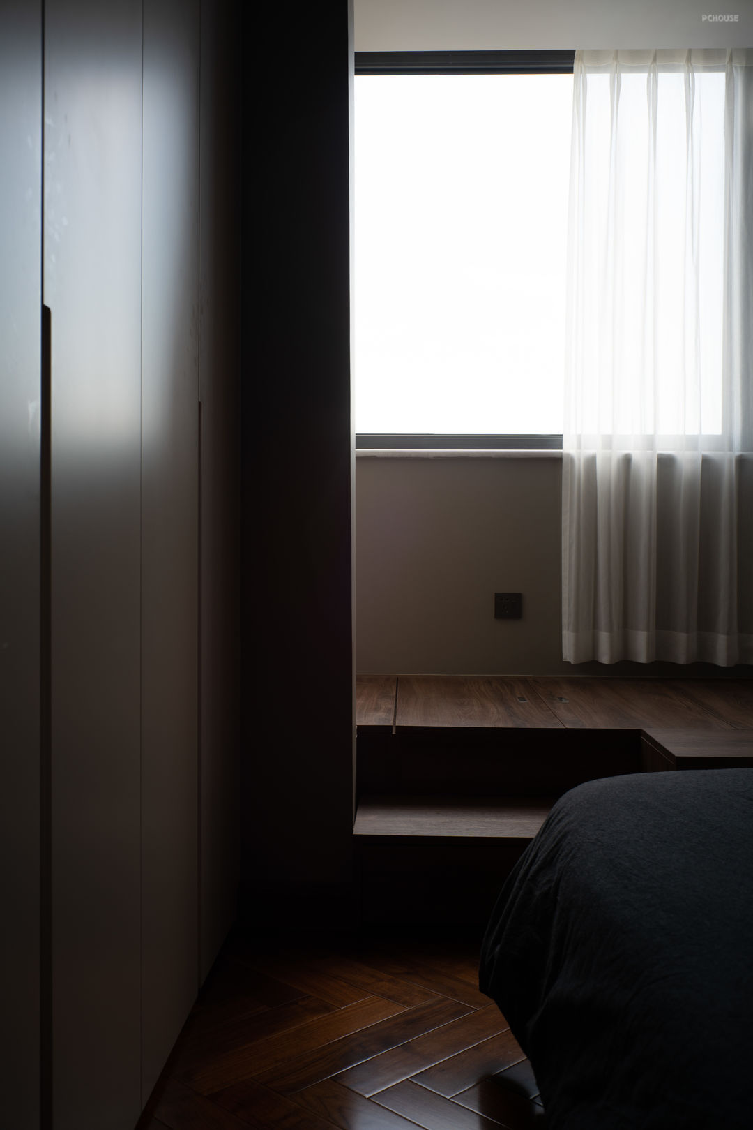 卧室的地台增加了很大的储物空间,像是一个躺下的高柜子,也让窗台没有原来那么高。
