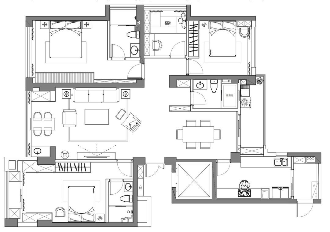 鉴于客户汗蒸和泡茶的需求,分别在卫生间划出一个汗蒸空间,在客厅划出泡茶的休闲空间。再规划一个多功能房,用于有客人来留宿只用,平时可作为书房使用。最大的难点就在于餐厅的尺寸不足,为此将备餐柜与墙面齐平,既保证了餐厅的空间,又完善了餐厅存储的需求。