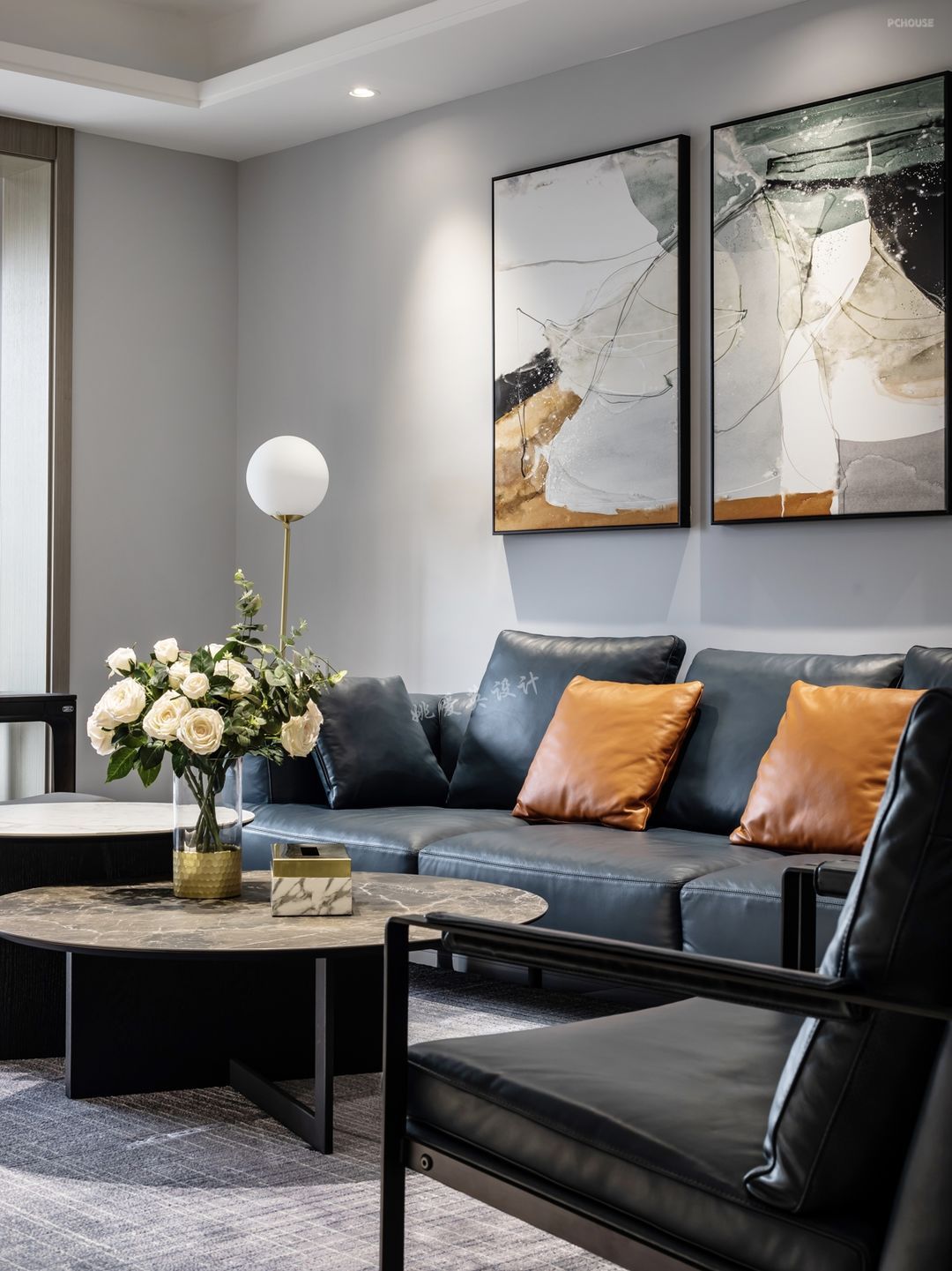 客厅在左,餐厅在右,备餐柜采用对称的形式,与另一端相呼应。地面采用铺贴瓷砖设计,便于女主人日常打扫,在灯光的映衬下,隐约中略带高级感~