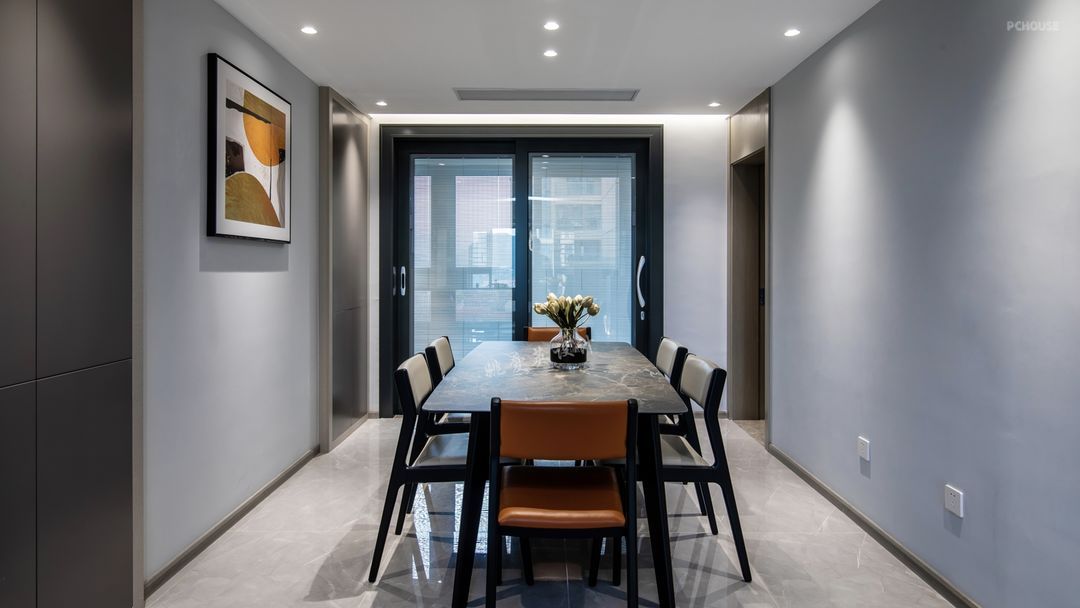 超薄的岩板餐桌,更能透露出主人不一样的品味。推拉门采用双层玻璃设计,玻璃中间嵌入窗帘,光线的调节只在一指之间,非常的方便实用。
