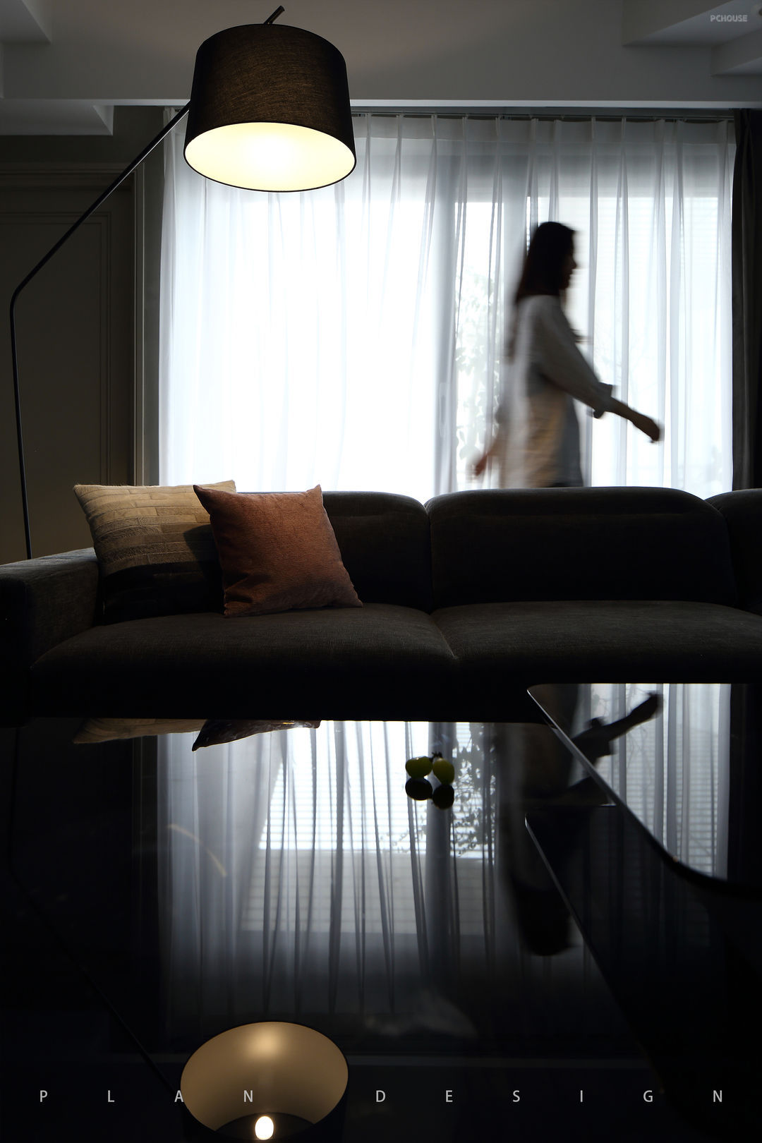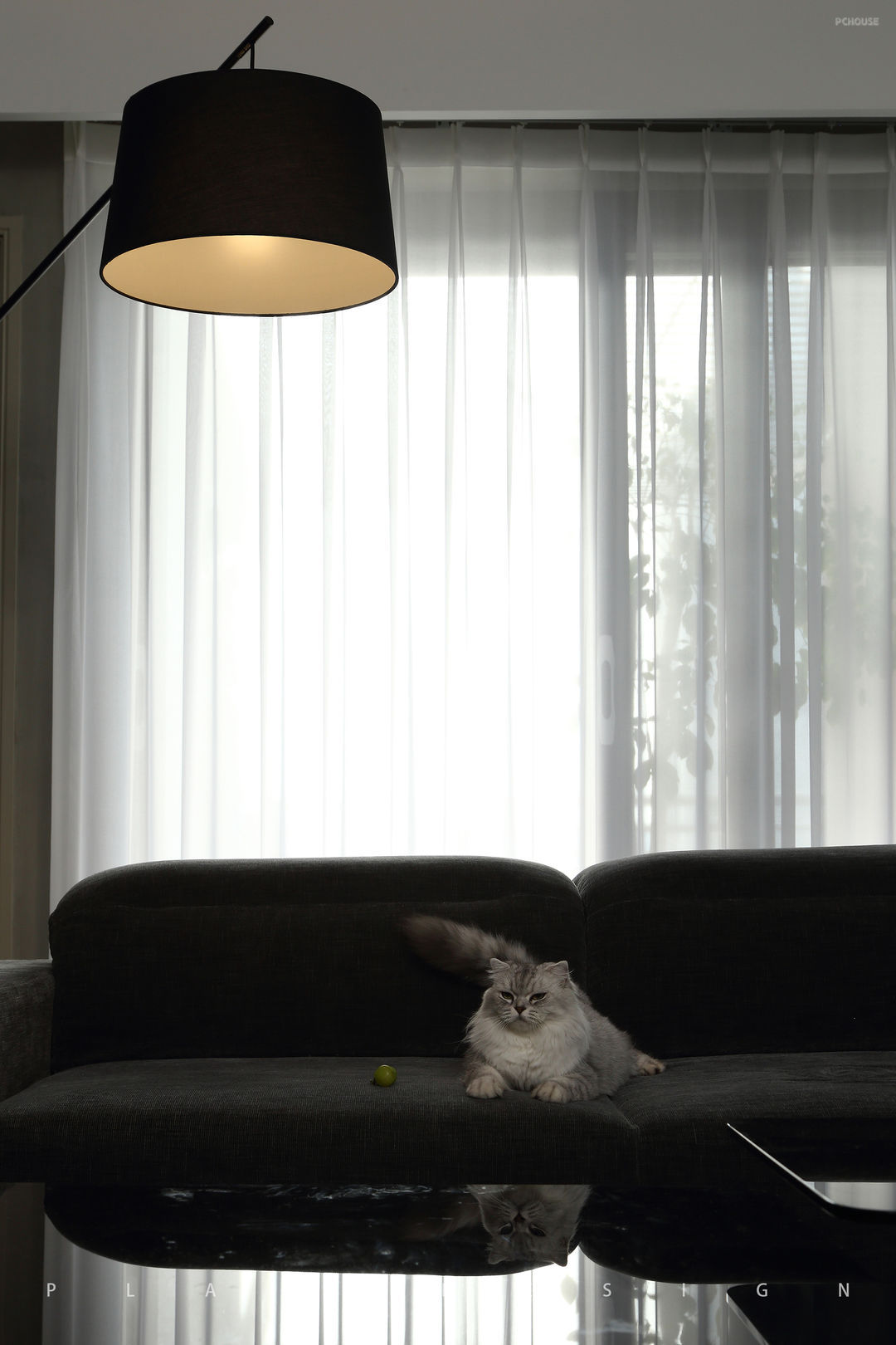 与花园、茶室相连的客厅在采光上完全不存在压力,电动双层窗帘即做到了装饰作用,又能有效的弱化原有建筑圆柱的突兀感。