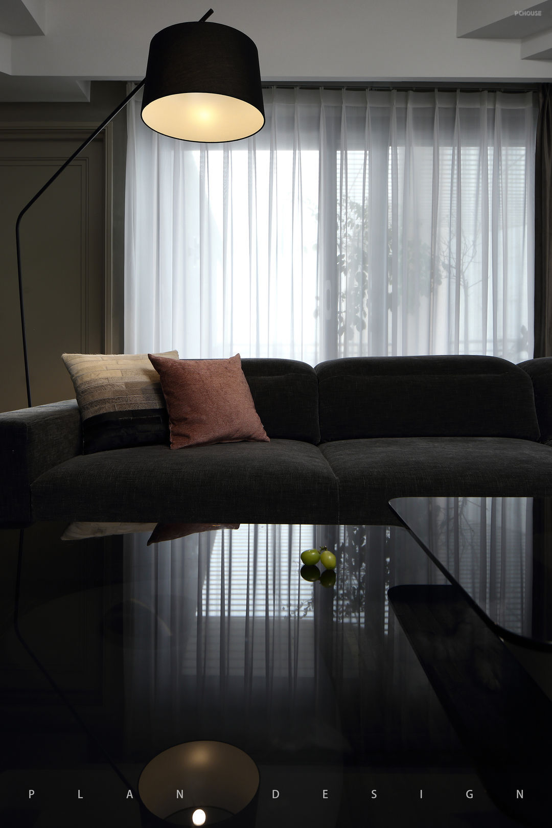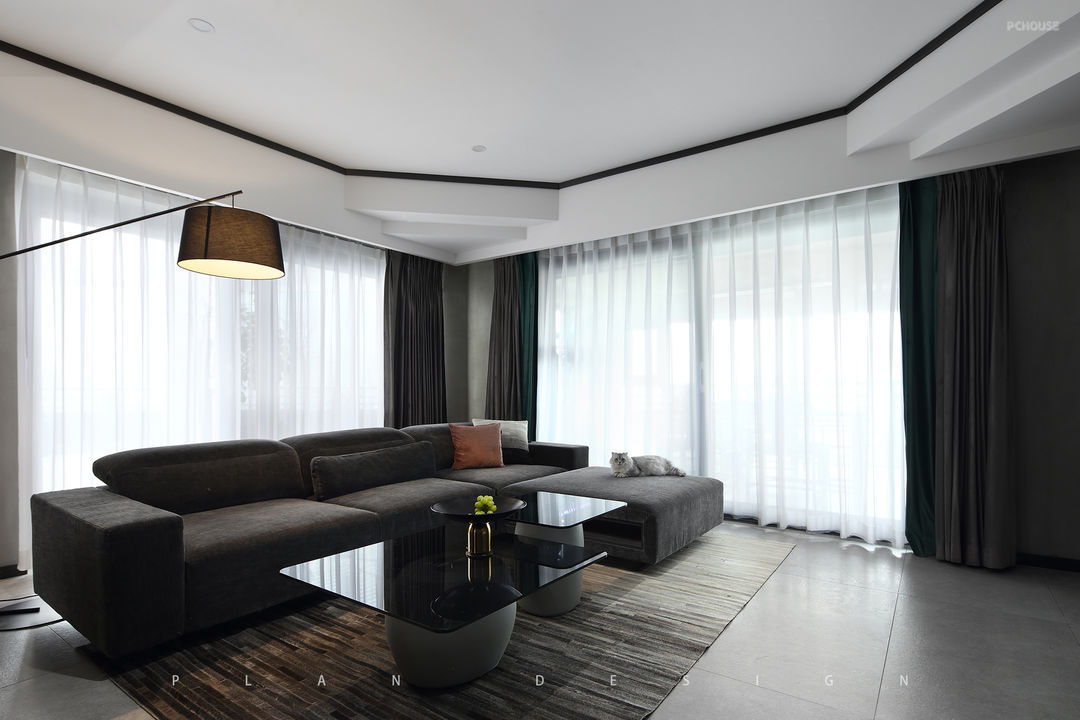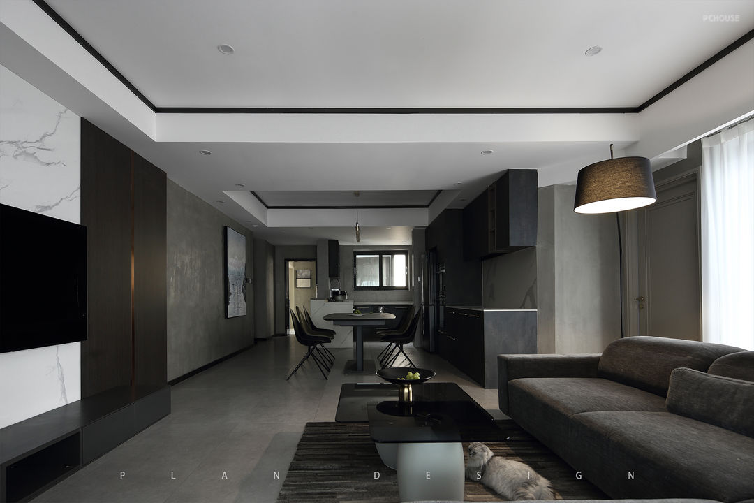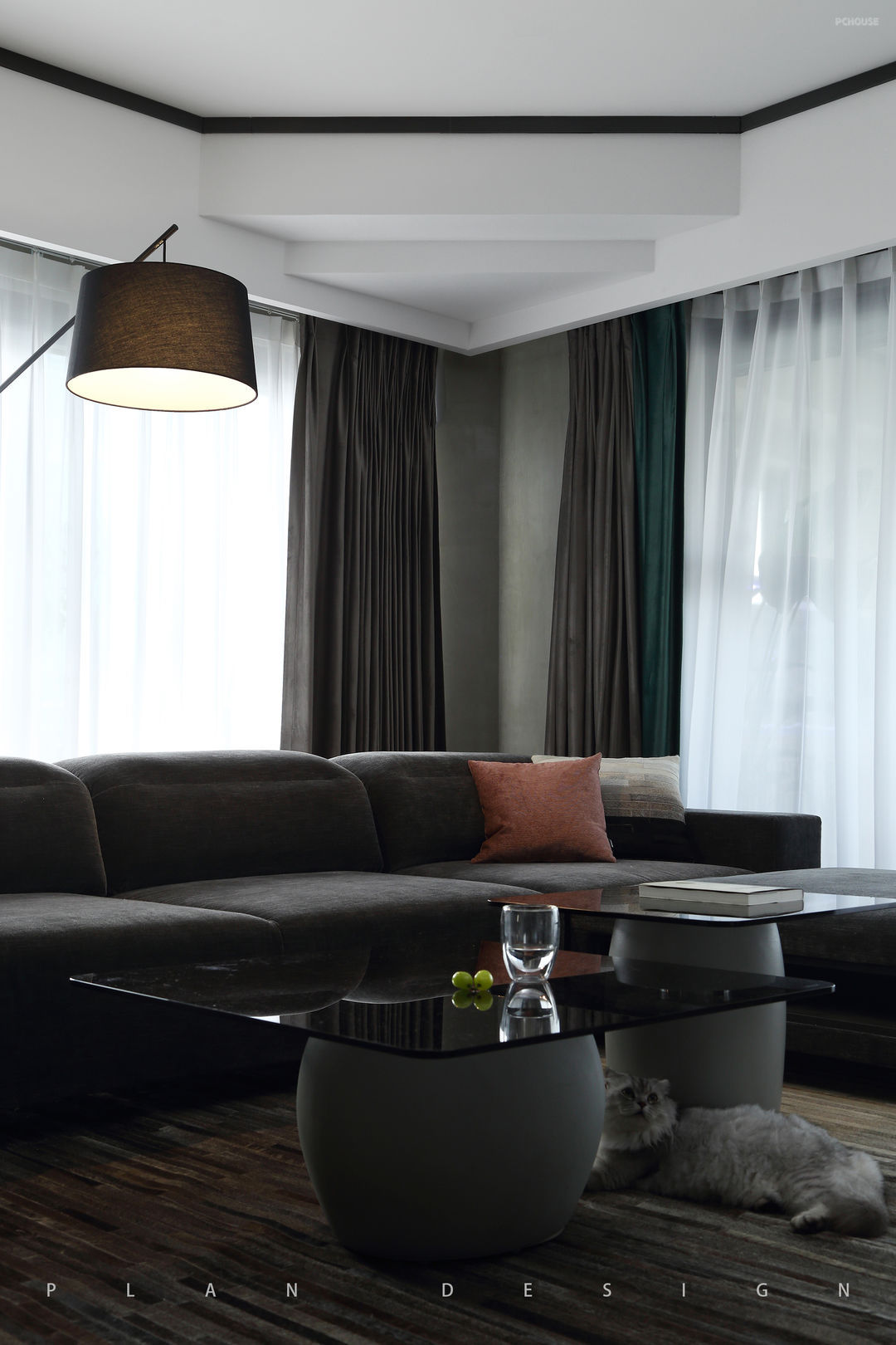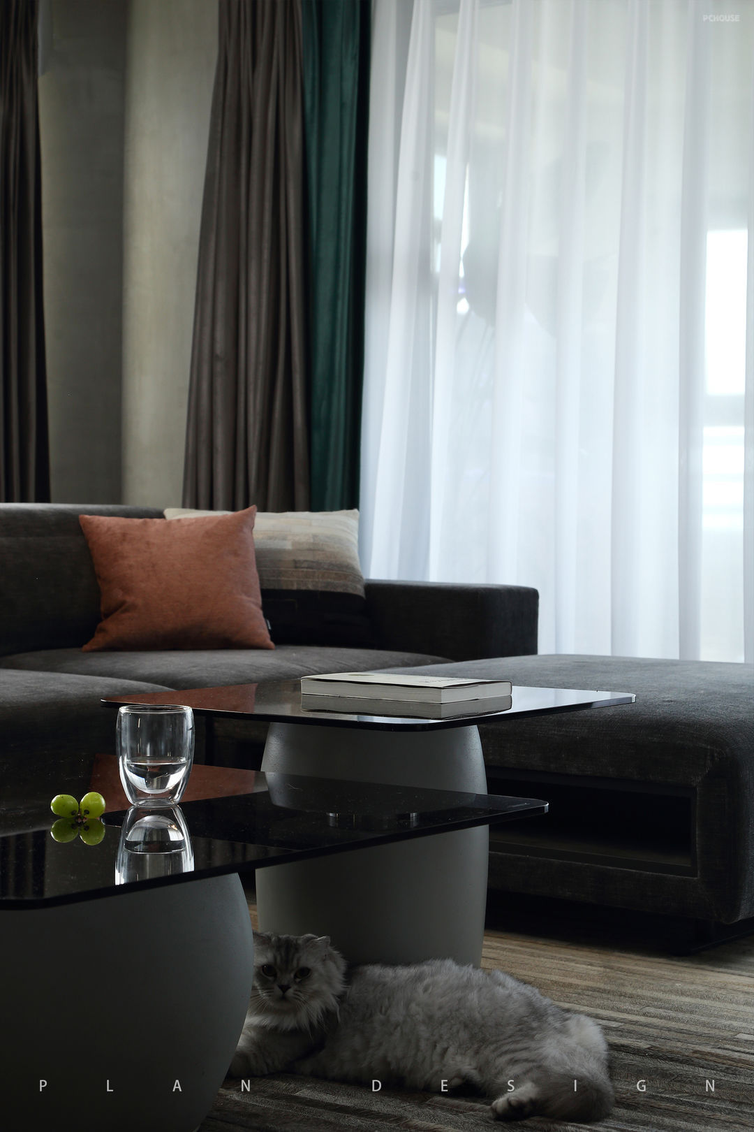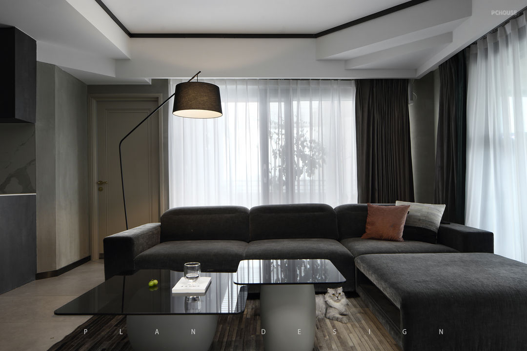 根据客户需求及户型格局,我们以现代风赋予整个空间以灰色调。带肌理的柔光瓷砖,顶上不锈钢线条增加了空间的层次感,深色灰色的沙发及窗帘让整体调性更为沉着稳重。