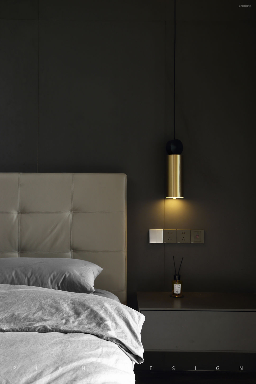 床头柜与背景墙选用相同的材质定制而成,悬挂式的安装营造视觉延伸感。