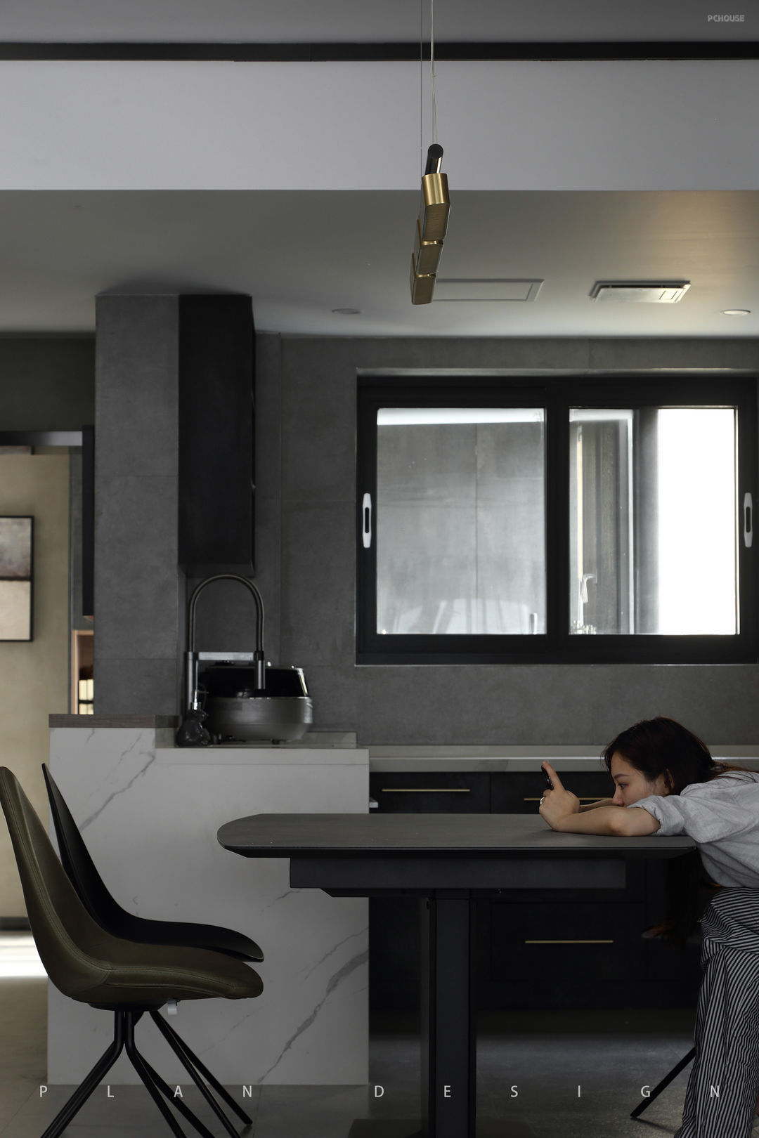 坐在西厨旁的餐椅上,一边能看到厨房里灶台上烧着的饭,一边能看到在沙发上大闹的锅巴,为屋主提供了一个可休闲、看书、静心的角落。