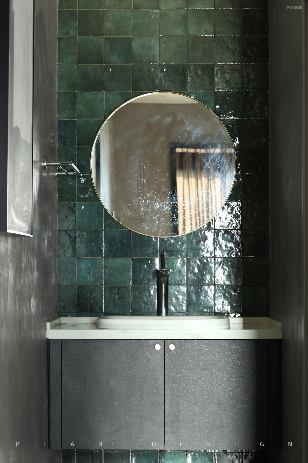 我们利用原来主卧进门处的走廊设置浴室柜,背后150*150的琉璃砖与挂墙浴室镜形成了走廊的端景,丰富了空间的层次。