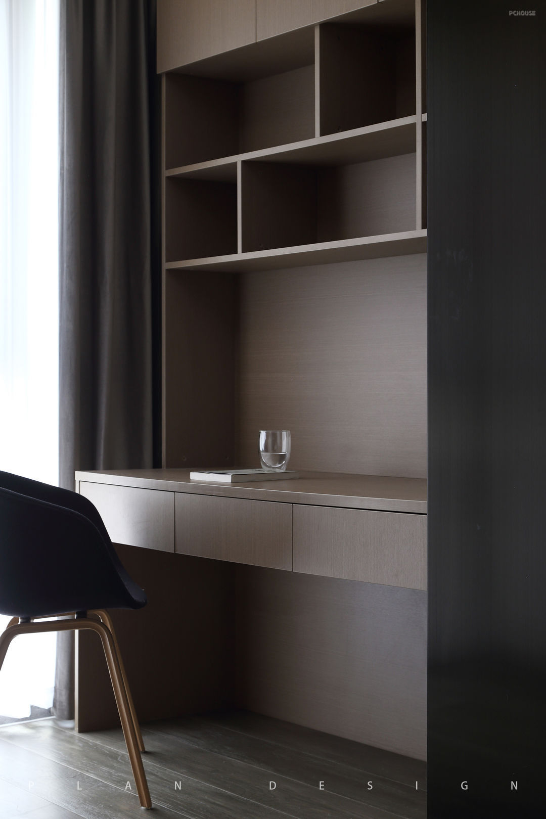电视墙选用了天然鱼肚白大理石,与落地的铁灰色电视柜形成色彩上的对比。电视柜反弹抽屉的设计省去了抽屉拉手的存在,更进一步体现出极简的调性。