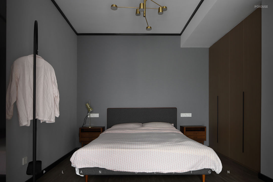 主卧与阳台之间我们采用了不锈钢门套,让现代风格更为凸显,床头铁灰色的木饰面板营造沉静的睡眠氛围。