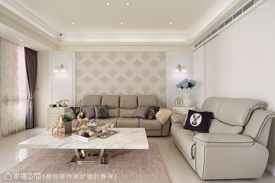 天花拉出层次且围塑出方正格局,沙发背墙利用线板框出对称造型,呼应柔美视觉。
