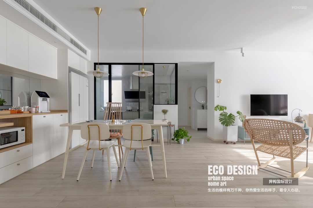 从这个角度看餐厅,客餐厨相互贯通,视野开阔,餐厅灯光照明部分只用了干净有设计感的黄铜吊灯,氛围感十足~
