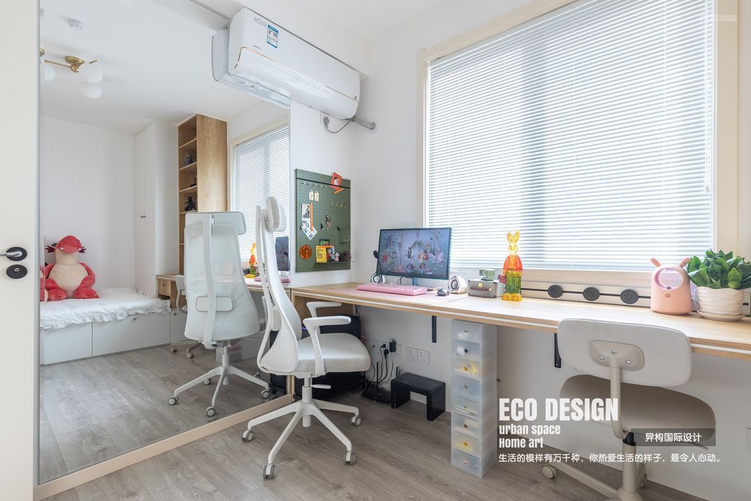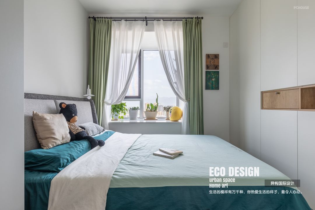 次卧面积不大,搭配清爽的绿色窗帘最舒服不过了,设计师特意做了两个通顶高柜来满足储物收纳的需求~