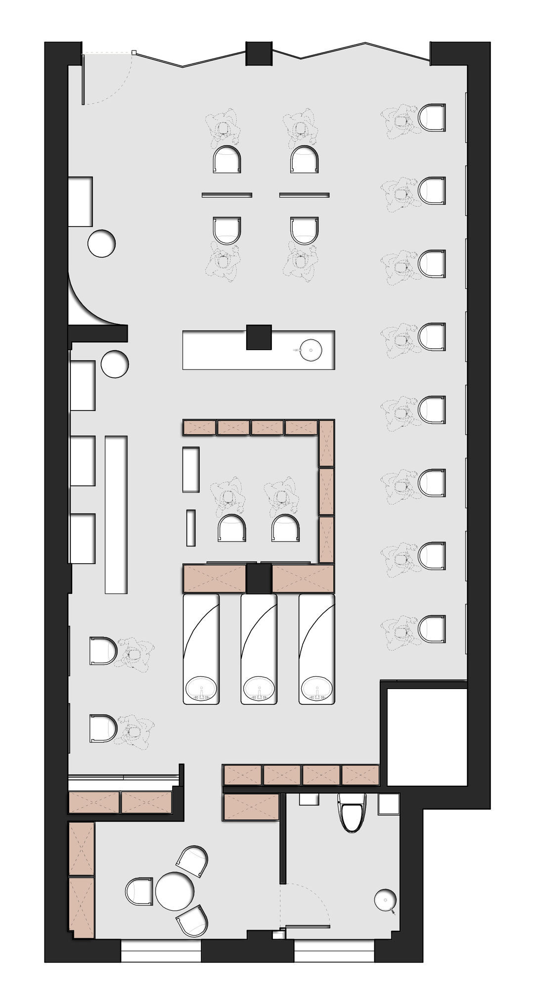 在黑、白的搭配下,以天鹅绒的沙发凳和乳白色软包组合成卡座,色彩上增加了绿色盎然的绿植点缀,以优雅且自然的情调丰富着视觉感受。#镜柜台 #单椅 #地板砖 #轨道灯 #工业风
