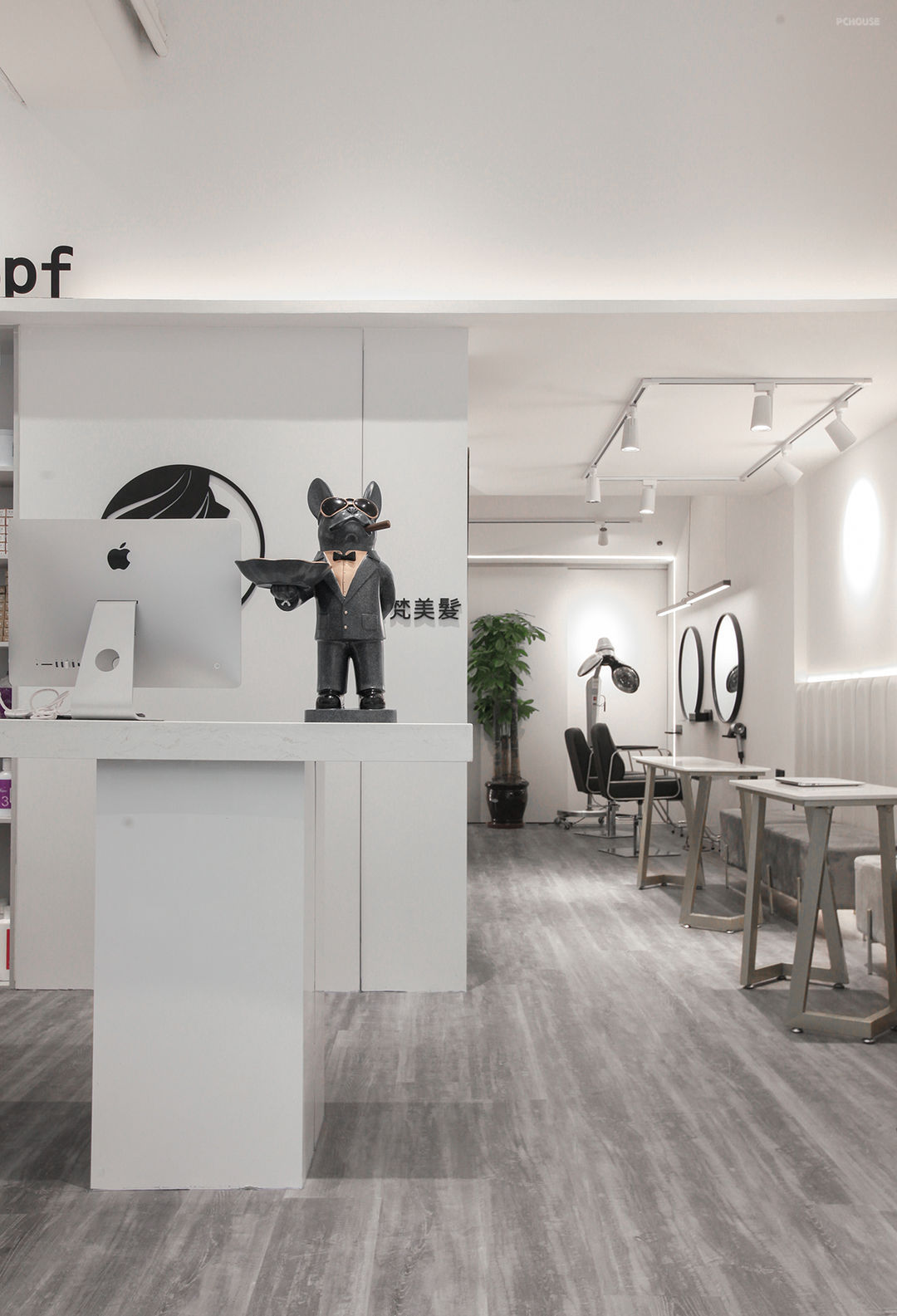 #镜柜台 #单椅 #地板砖 #轨道灯 #工业风 #黑白