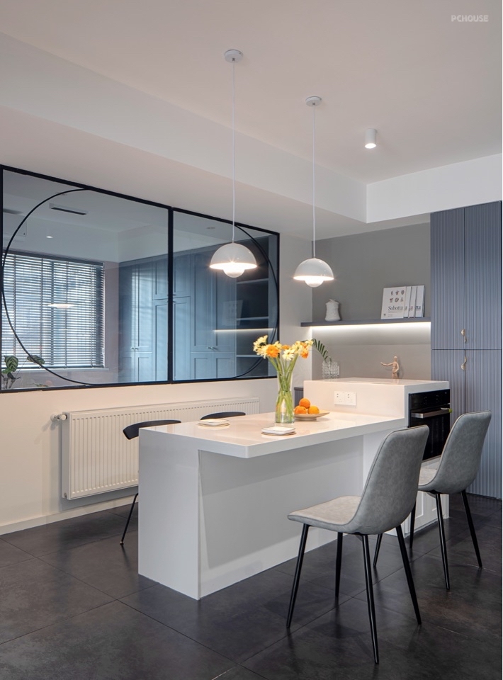房子进来首先就是餐厅,比较狭小,我这里扩大了餐厅,缩小了书房,通过书房的窗户让餐厅达到采光的效果。老铁框是找打铁的师傅做的,大概是240元。餐厅设计的餐桌与倒台一体,增加餐厅的趣味,然后嵌入了一个烤箱,台面可以用来做烘培手作,也是希望可以体现一种新生活方式,餐厅不仅仅可以用来吃饭。整个餐厅的色调使用的互补色,用了冷暖两色的搭配,降低了色彩饱和度,使色调更协调。