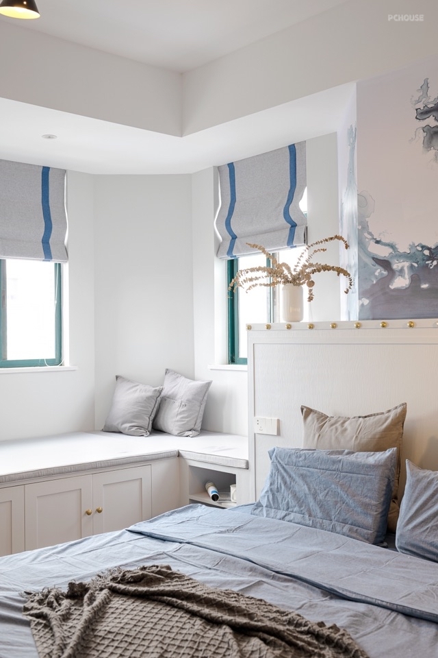 这是主卧的近景,八角窗帘这里用的是罗马帘,简洁也更好打理,八角窗的地台属于一个多功能区,也可以当作一个儿童小床,这张图可以看到加长的床靠背,沿着边边钉了一圈铆钉,这样看起来会更高级一些。