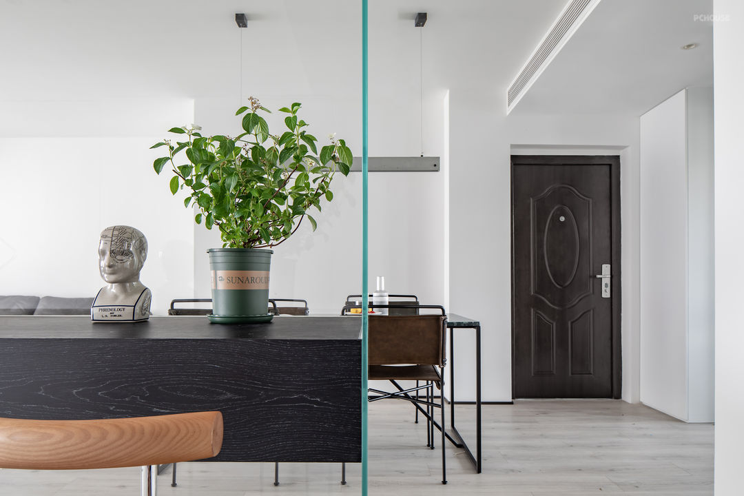 餐厅看向客厅和书房面,视野连贯;设计之初是想让家里各个空间有更多的互动,采用超白钢化玻璃连接电视墙体和书房墙面,视觉上很通透;#客厅 #沙发 #茶几 #陀螺椅 #落地灯 #绿植 #现代