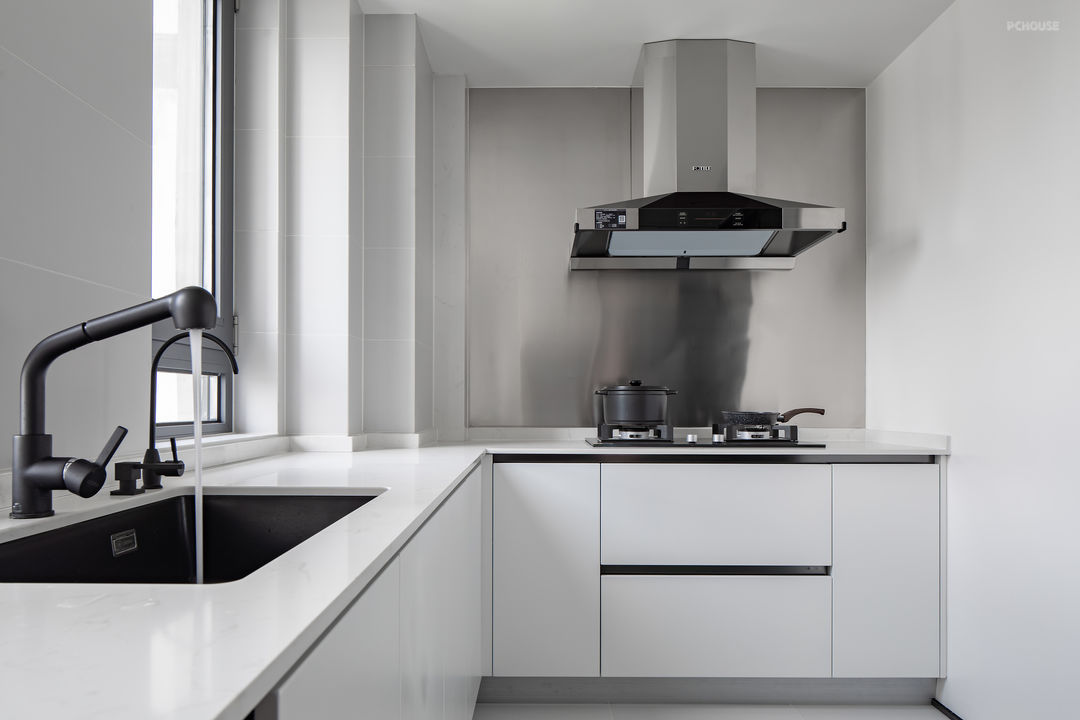 厨房是以白色调为主,台面是用白色石英石,并且没有采用下挂边的做法,看上去会比较轻薄,比例也会舒服很多。相比较传统下挂边的台面,喜欢的可以试试。柜门均采用免拉手的做法,更加整体一点,黑色的内嵌围挡边和柜门形成视觉对比;灶具后面的墙体用的是不锈钢墙面,这样和灶具的材质能够统一起来,并且打扫起来也比较方便; #厨房 #美缝 #台面 #柜门 #不锈钢 #现代