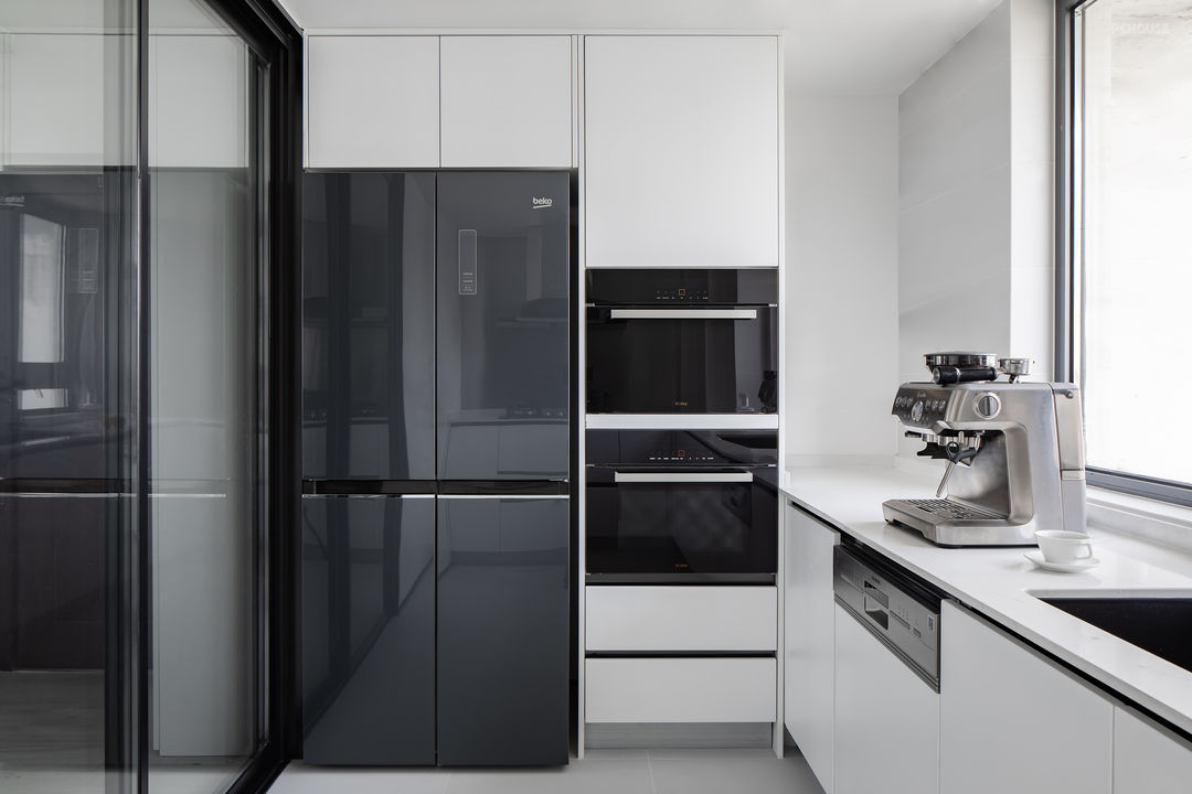 厨房所有柜门没有做明装拉手,台面石材和柜门之间留了暗拉手;为了整体统一,洗碗机也穿上了“新衣服”厨房的窗户由原来的一扇变成了两扇,其中一扇我们选择做整块的封闭玻璃,有一扇窗户能够通风就够了,并且整块的玻璃能够最大化的提升空间的采光和视觉效果; #厨房 #橱柜 #洗碗机 #咖啡机 #现代