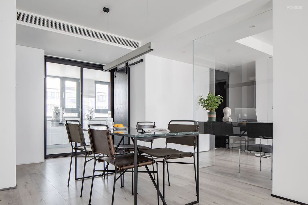 餐厅的右侧就是开放式书房空间,玻璃隔断让过道,餐厅,书房之间相互贯通。在这个公共区域里面,每个功能区既是相对独立的,也是相对融合的; #餐厅 #餐桌 #餐椅 #水泥吊灯 #玻璃 #现代