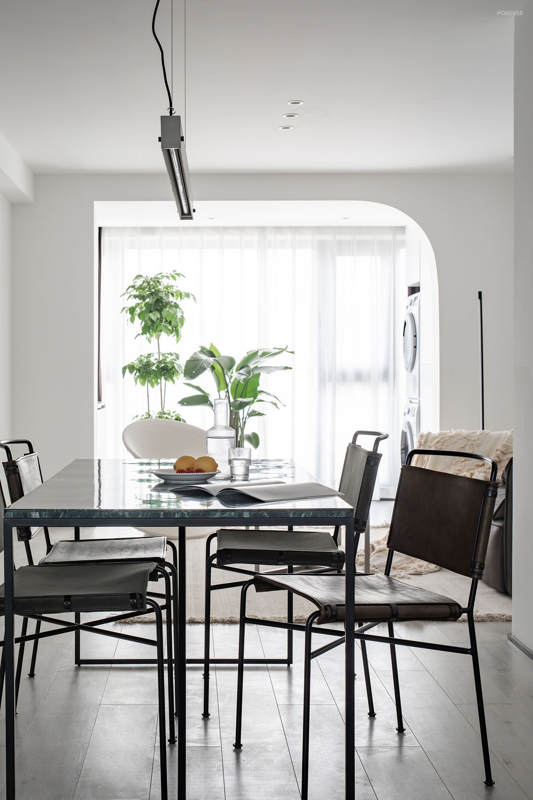 餐桌选择了墨绿色大理石面黑色铁艺腿,整体比例较为纤细,视觉上会显得比较苗条。餐椅同样是选择了铁艺腿的皮座椅; #餐厅 #餐桌 #餐椅 #铁艺 #吊灯 #水泥吊灯 #现代