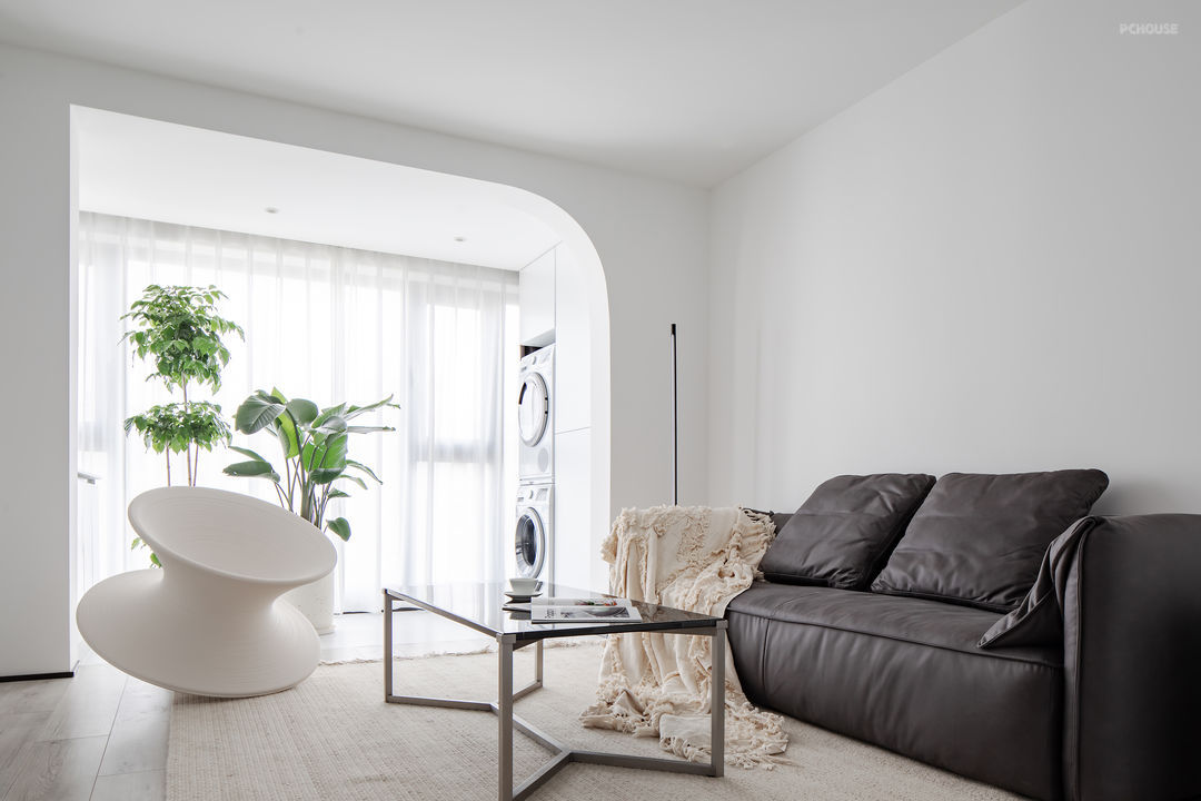 客厅和阳台门洞做了不规则造型处理,一边是直角,一边是弧形;这样的不规则让原本干净整洁的空间多了几分趣味; #客厅 #阳台 #沙发 #茶几 #陀螺椅 #绿植 #挂毯 #落地灯 #现代