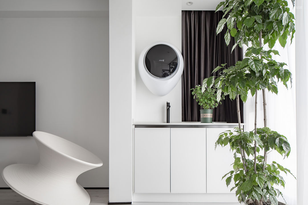 将原来客厅和阳台之间的移门拆掉,形成客厅阳台一个大空间;挂壁式洗衣机想要后期干干净净露在外面,需要前期水电阶段预埋下水管道和电源; #阳台 #绿植 #挂壁洗衣机 #陀螺椅 #现代