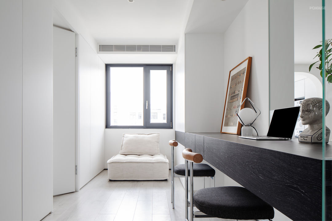 长条的书桌贯穿了整个书房的一面,高柜中间部分也做了和书桌等高的抽屉,形成了黑白穿插的效果; #书房 #书桌 #桌子 #椅子 #绿植 #装饰画 #现代