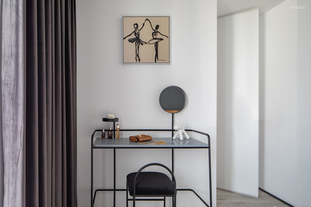 床尾空间放置一张造型款式和整体家具统一的梳妆台,梳妆凳。梳妆台自带梳妆镜,也是显得更加高级; #卧室 #梳妆台 #梳妆镜 #梳妆凳 #隐形门 #装饰画 #现代