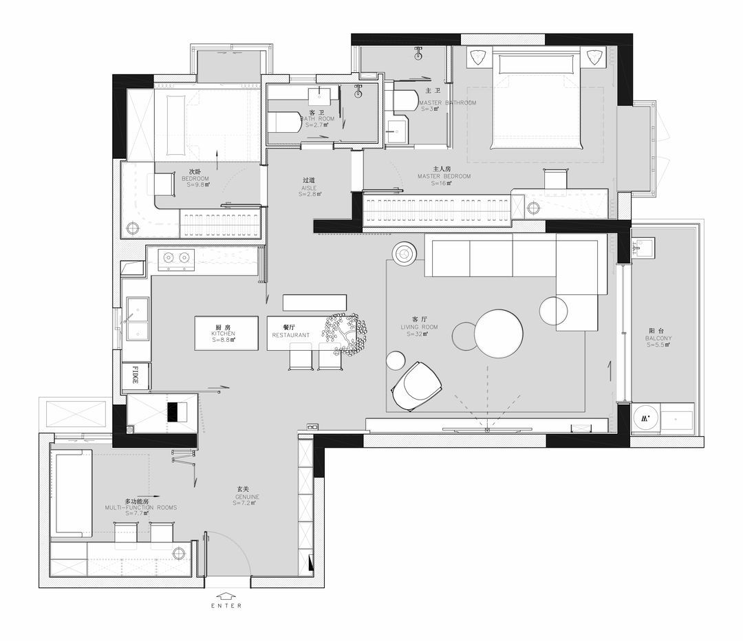 前言: 简洁硬朗,自然质朴,126平方米的灰度空间,有力却也温柔。极简的线条加上纯粹的色调,让空间空灵纯净。设计的语言,倾泻在空间尘埃中,似柔软的生活调剂。极简的设计能让生活变得纯粹,让人更加注重生活本身。