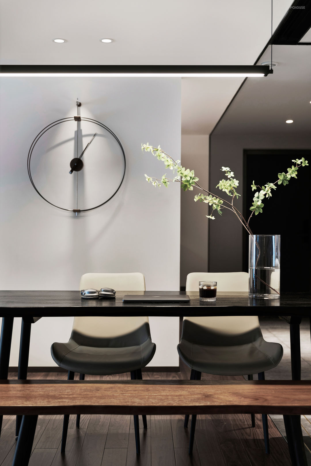 墙面个性挂钟佐以细脚餐椅,增加了空间趣味性,同步融合简洁设计语言,勾勒出了整个区域的层次感。