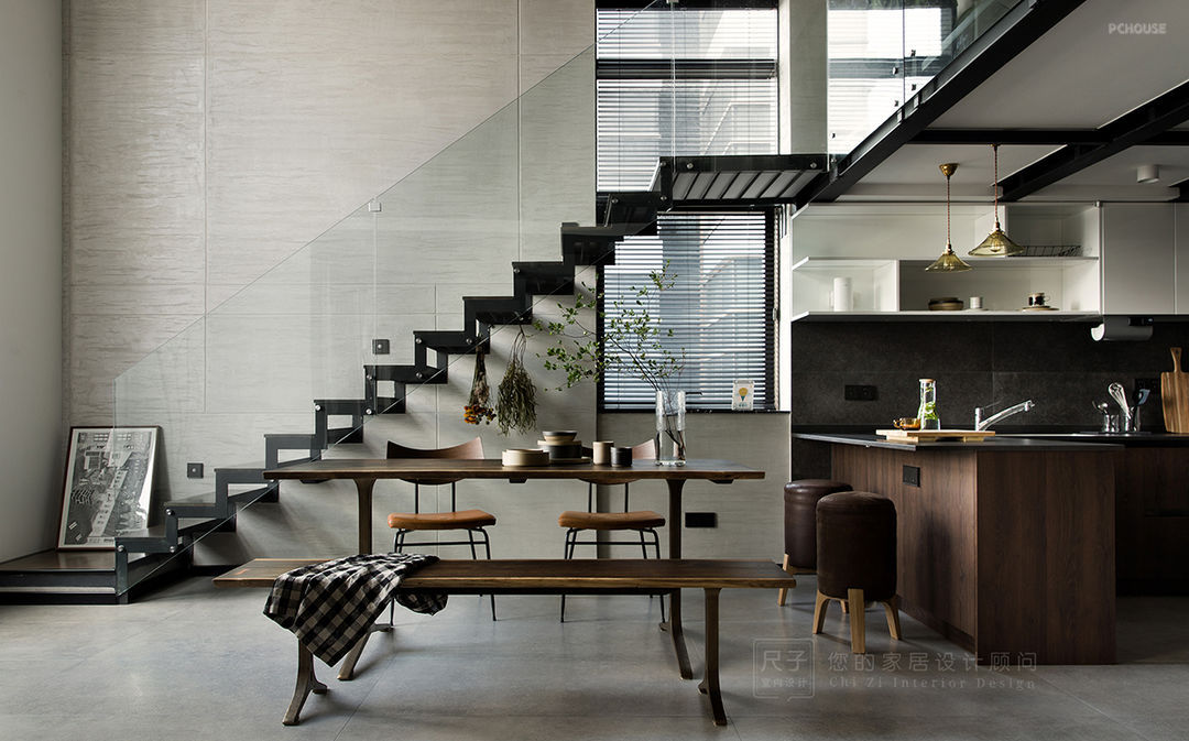 “建筑艺术的要素是墙和空间,光与影”。客餐厅挑空设计,铁艺+玻璃元素,粗犷与清透的结合,最大程度弥补层高不足带来的采光难题。