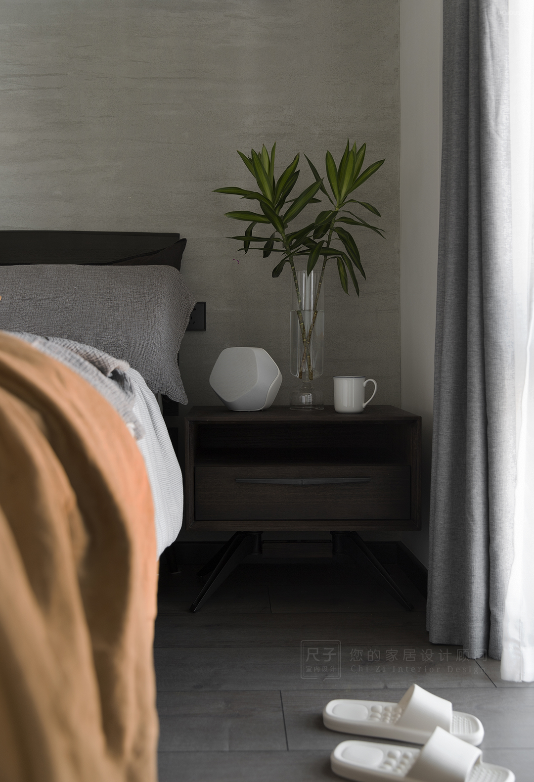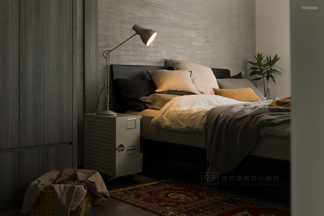 黑白灰、水泥墙营造的冷静克制氛围,让人不由得放慢节奏去思考;复古个性的床头柜与地毯,柔软舒适的床品抱枕,这些细节处的软装搭配又让整个家在理性中不乏温情。