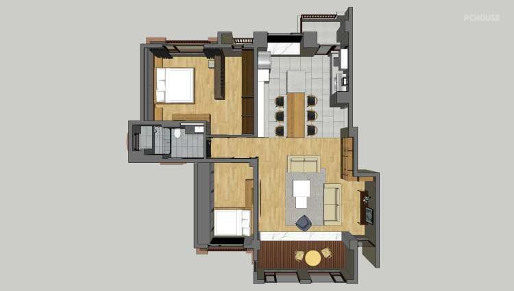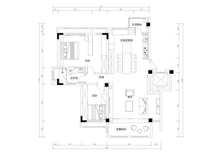 其实这个案例比我发的上一个案例完成的更早,也是我手上造价最低的一个案例(大概全屋所有70+)。先看平面吧,这个是一个女性业主的临时居所,就她一个人和保姆。所以把建面120平的房子从三居室改成了两居室,并取消了一个卫生间。改完如下图