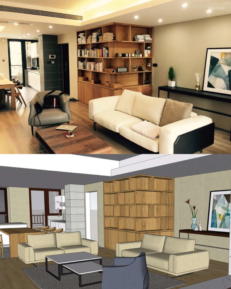 先从客厅开始说吧,第一张图是用手机拍的和SU的一个对比,可以理解为方案还原度的重要性