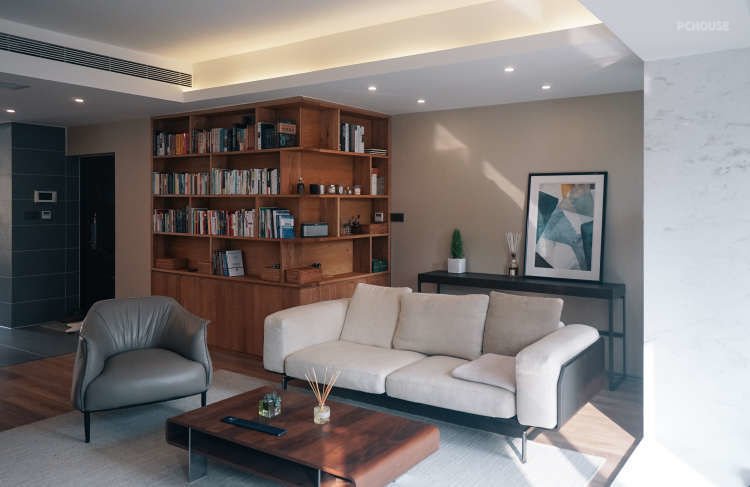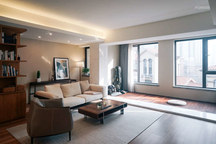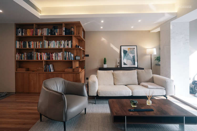 其实这个客厅非常大,由于业主不怎么对外接待,所以我故意选择了一套小沙发,这样居中布置沙发,会让家具更有陈列感,同时增加呢洄游动线和艺术品陈列空间,提升空间的品质感。