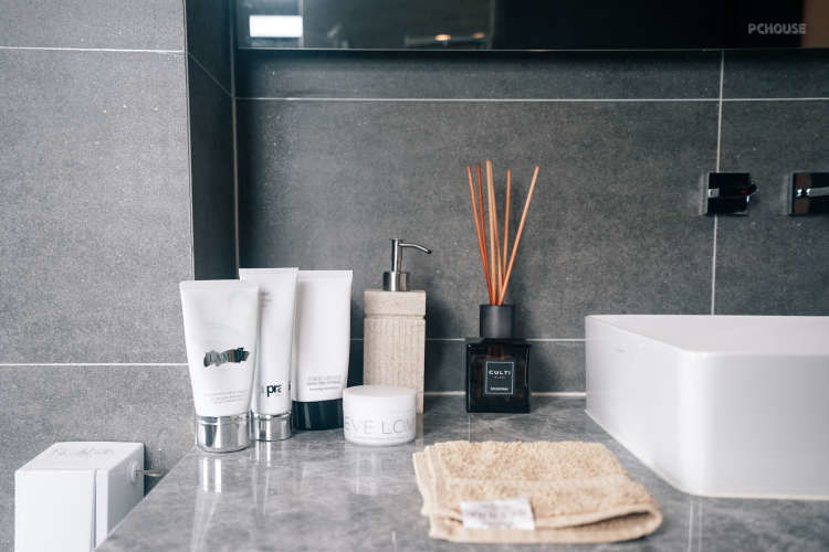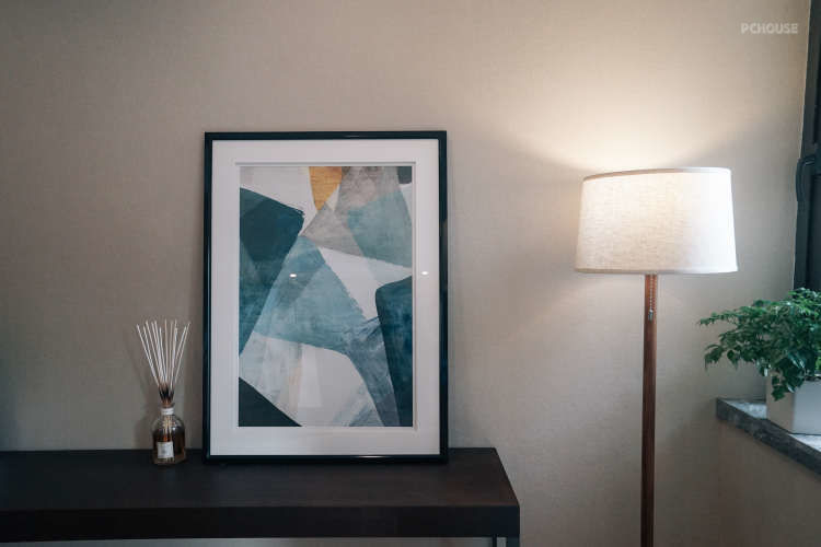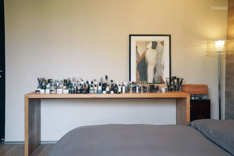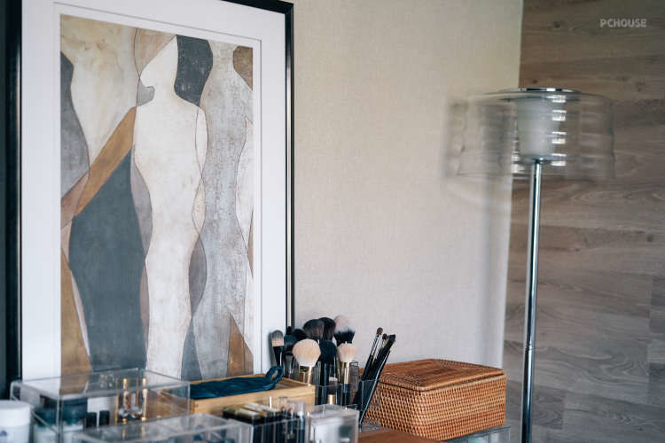 这张妆台,也是我们设计并定制的实木家具,上面摆满了业主的各种化妆品,家里所有的装饰画也是我们选的,淘宝上业主自购